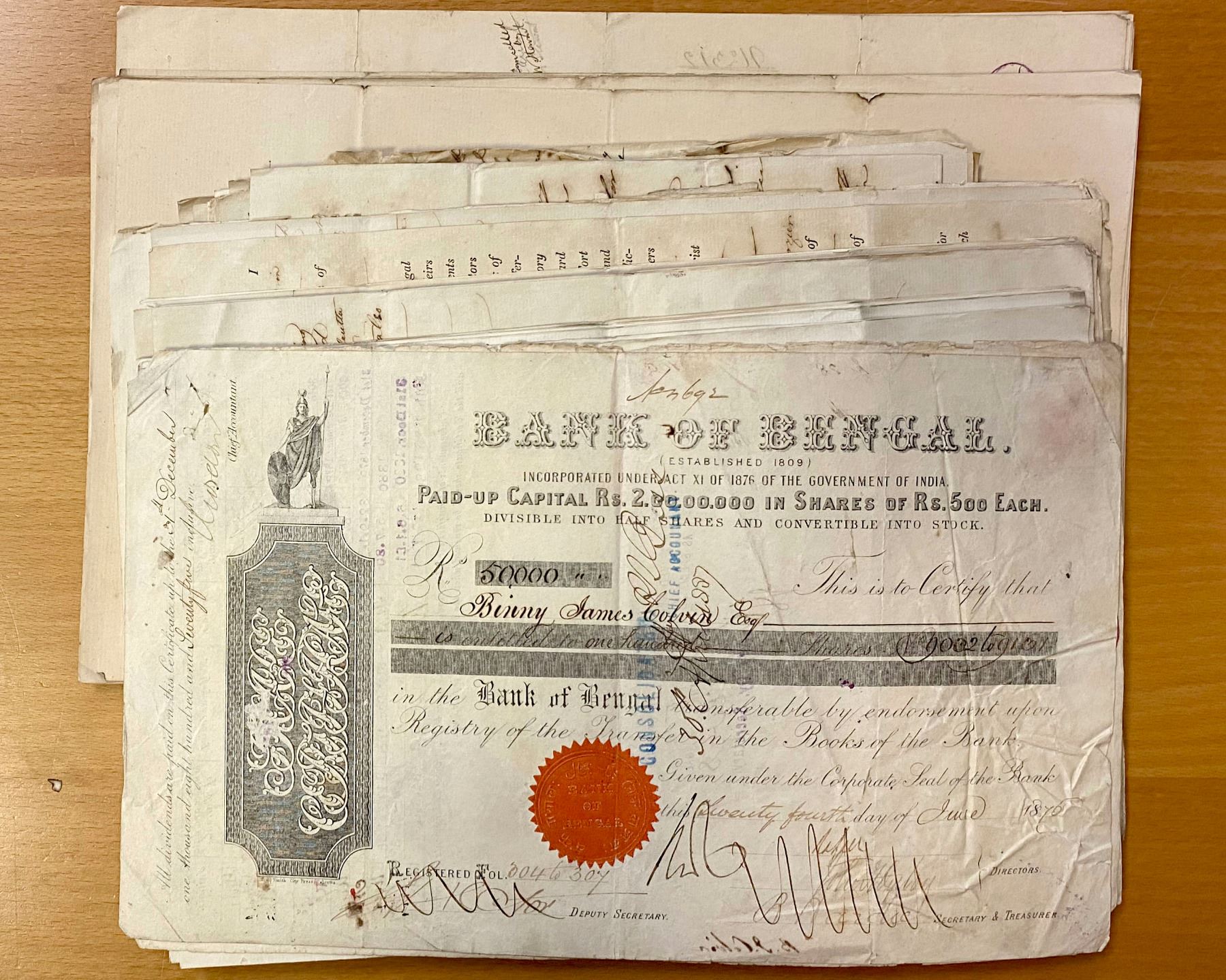 BENGAL PRESIDENCY: LOT of 88 items, group of fiscal paper from circa 1840 to 1890 from the Bank of Bengal mostly in English language with some in Bengali or Urdu, including; Bank of Bengal Stock Certificates (2); Bank of Bengal Bonds of Indemnity issued in the "Legal Money of Bengal," mostly dated 1842 with signatures in a variety of languages with red wax seals (19); Transfer and Registration Certificates from the Bank of Bengal for the transfer of stock certificates (30); Receipts from the of Bengal to the Calcutta Gazette for the Bengal Military Orphan Press (3); Receipts from the Bank of Bengal Exchange Rooms to the Calcutta Exchange Gazette and Daily Advertiser (3); Bank of Bengal memos, letters and correspondence (31), many with official British Indian revenue stamps and embossed seals, others with various ink seals, a very interesting and historical glimpse into banking during the Bengal Presidency, average quality examples, retail value $350, lot of 88 items.