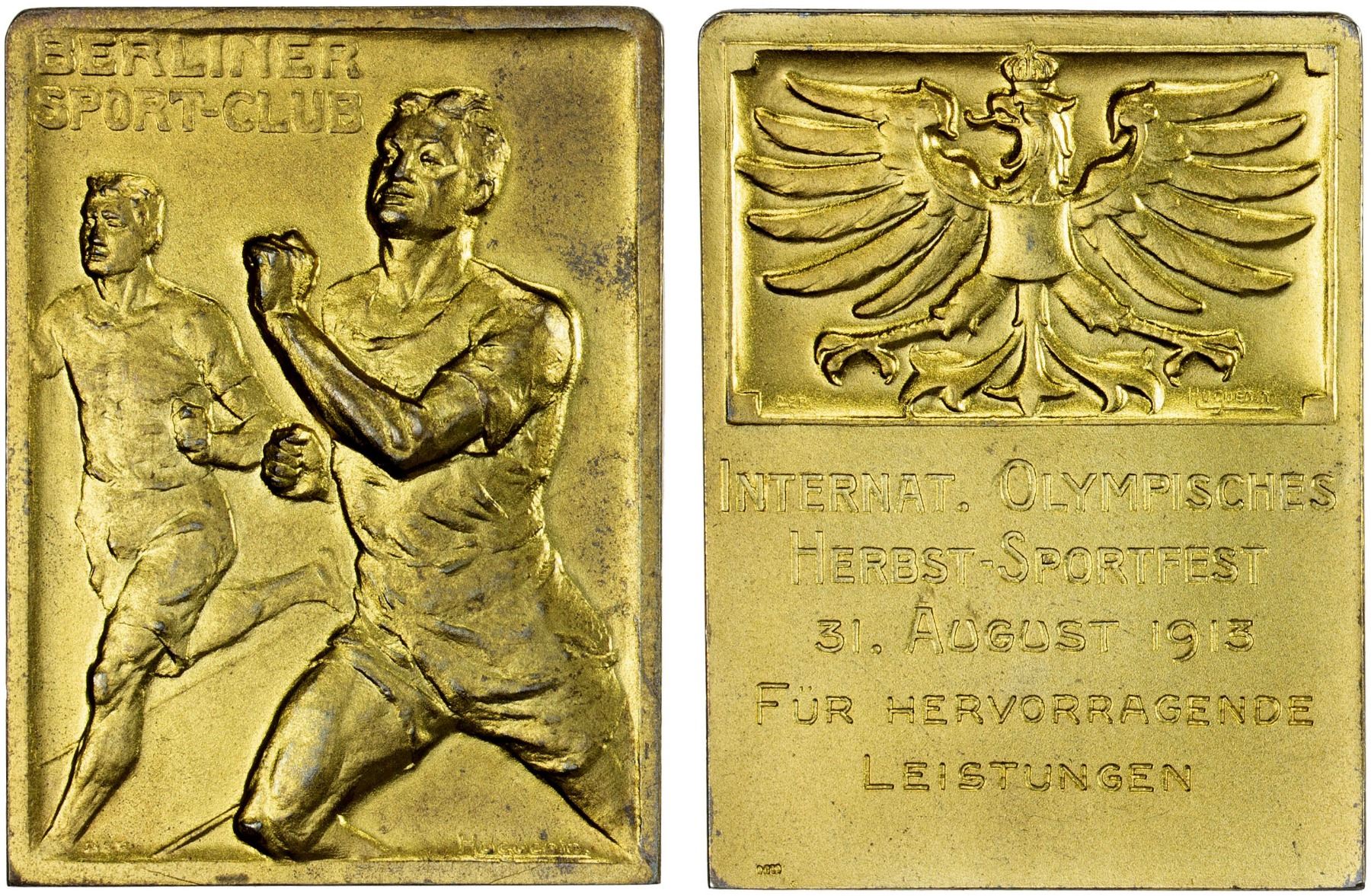BERLIN: AR plaque (41.98g), 1913, 47x36mm gilt silver award plaque of the International Olympic Autumn Sportfest by Dep. for Huguenin Freres for the Berliner Sport-Club, two male athletes running three-quarter left with BERLINER / SPORT-CLUB in upper left corner // crowned Prussian eagle with head left with INTERNAT. OLYMPISCHES / HERBST-SPORTFEST / 31. AUGUST 1913 / FÜR HERVORRAGENDE / LEISTUNGEN below and miniscule "0.900" in bottom left corner, in plush grey-green case, plain edge, Unc, ex Donald Young (with tag).