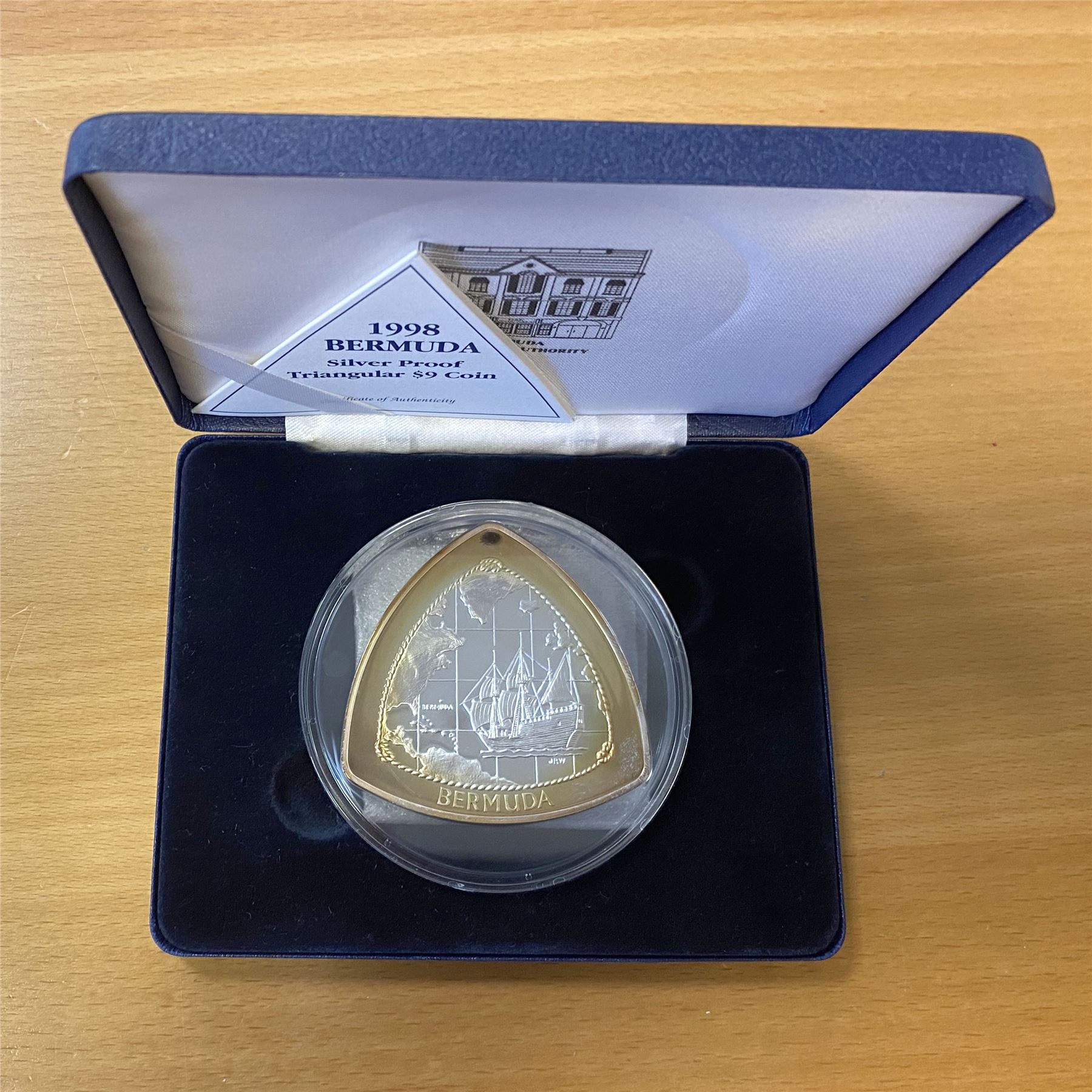 BERMUDA: Elizabeth II, 1952-, AR 9 dollars, 1998, KM-112, Bermuda Triangle Commemorative Series - Sailing Ship Deliverance, triangular-shaped coin containing 155.52g of pure silver struck at the British Royal Mint with original case of issue and COA, Proof.