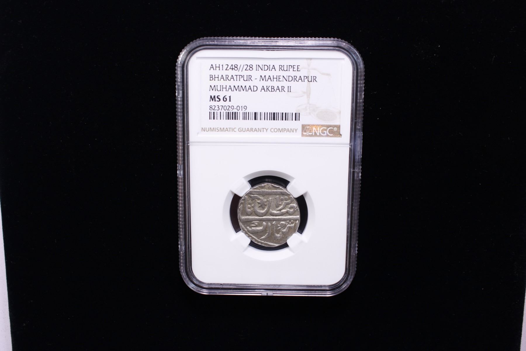 BHARATPUR: AR rupee, Mahe Indrapur, year 28, KM-116, in the name of the Mughal emperor Muhammad Akbar II, attractive light luster, NGC graded MS61.