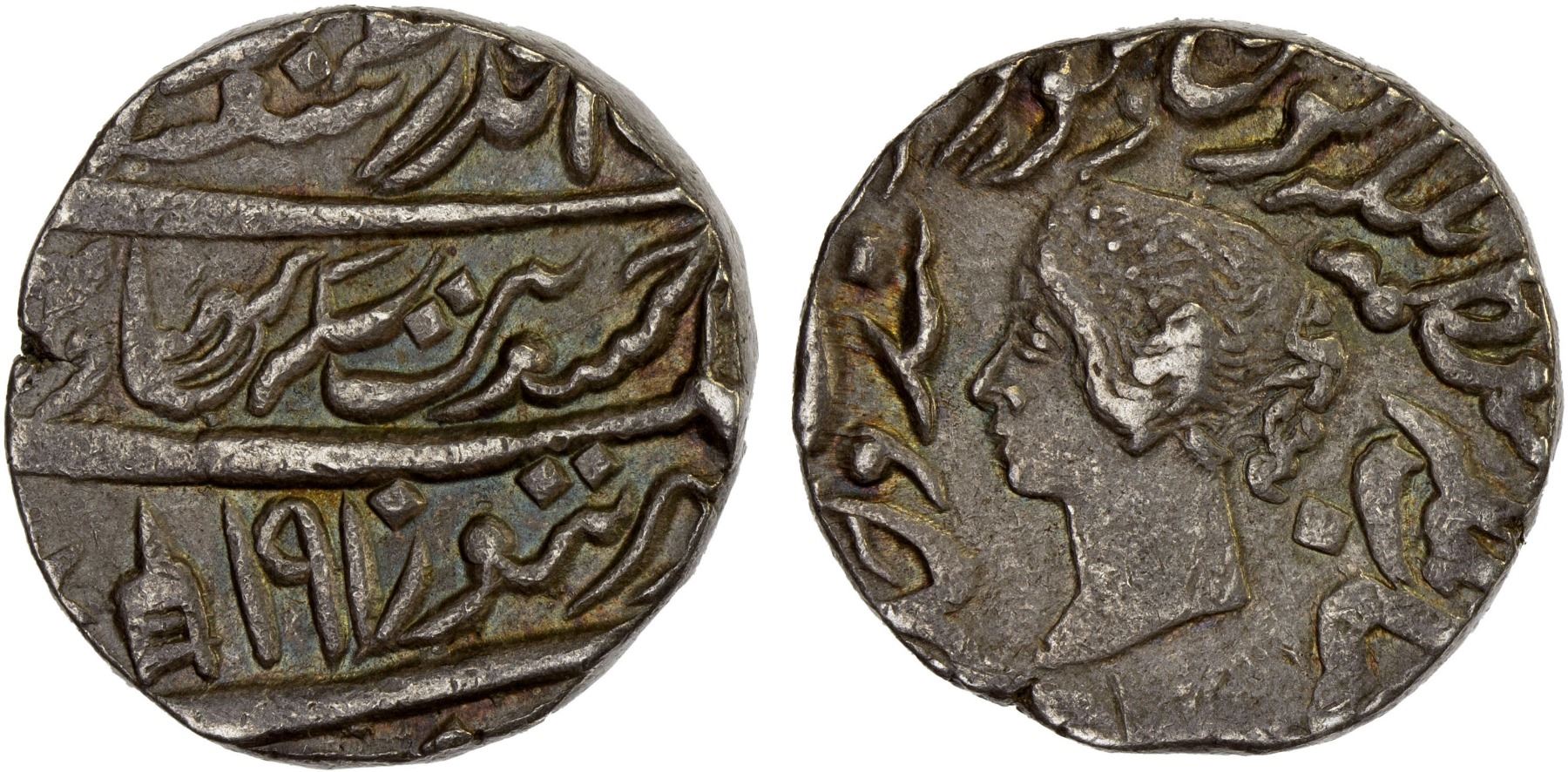 BHARATPUR: Jaswant Singh, 1853-1893, AR rupee (11.12g), Braj Indrapur (Bharatpur), VS1910, KM-157, portrait of Queen Victoria on the obverse, VF-XF.