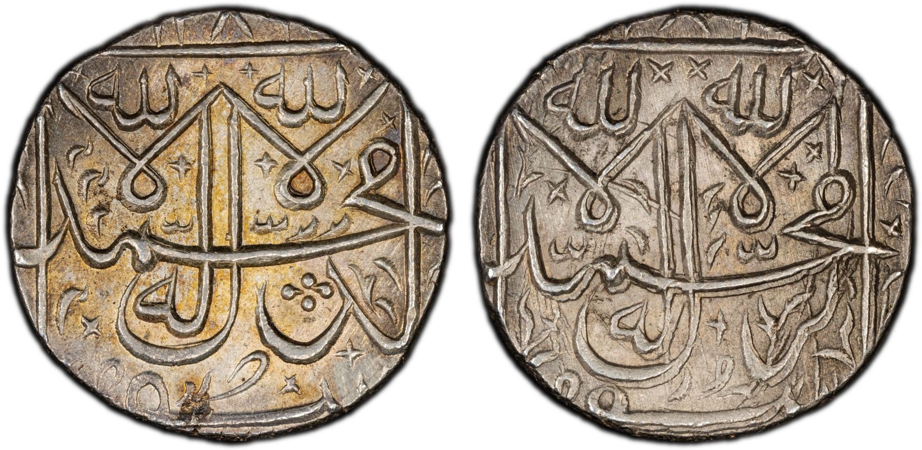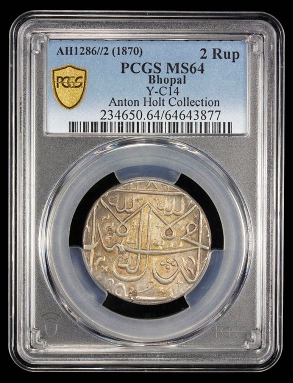 BHOPAL: Shah Jahan Begam, 1868-1901, AR 2 nazarana rupees (21.81g), AH1286 year 2, Y-C14, with only the Muslim Kalimat at-Tayyibah (Word of Purity) on both sides, bold strike, with collector's original index card with provenance and date of purchase, a wonderful lustrous mint state example! PCGS graded MS64, ex Anton Holt Collection.