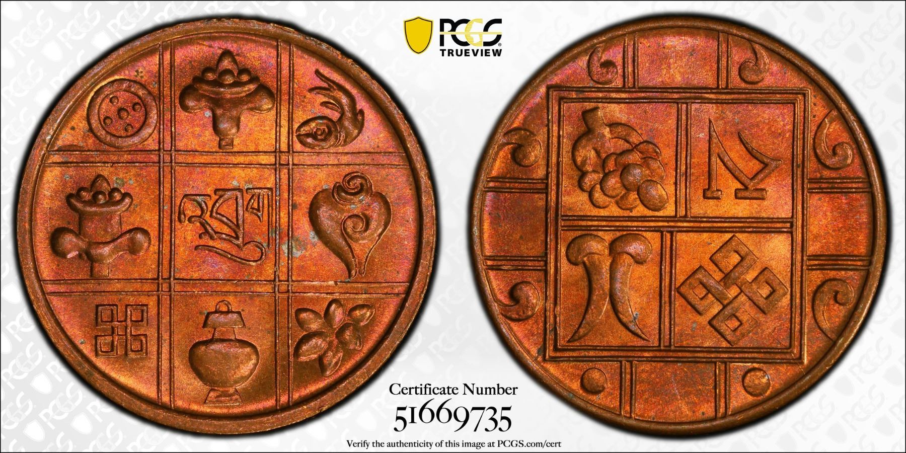 BHUTAN: Jigme Dorji, 1926-1952, AE pice, ND (1954), KM-27, struck at the Calcutta mint, a superb lustrous example! PCGS graded MS65 RD.