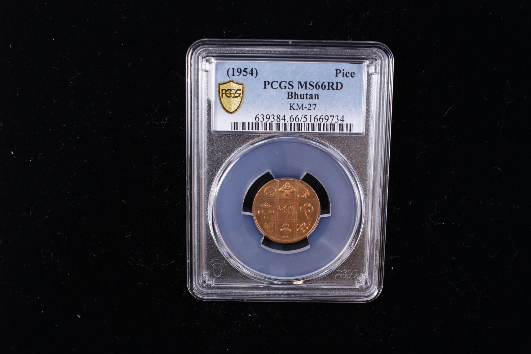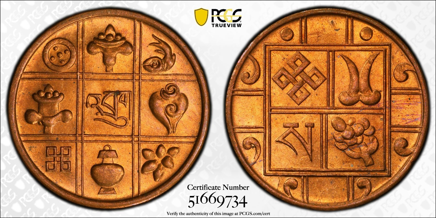 BHUTAN: Jigme Dorji, 1952-1972, AE pice, ND (1954), KM-27, struck at the Calcutta mint, a fantastic lustrous example! PCGS graded MS66 RD.