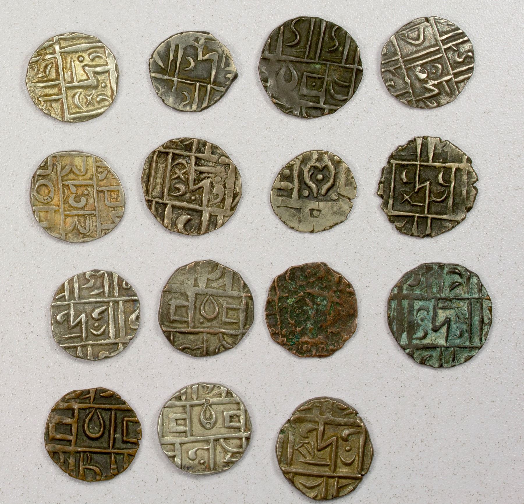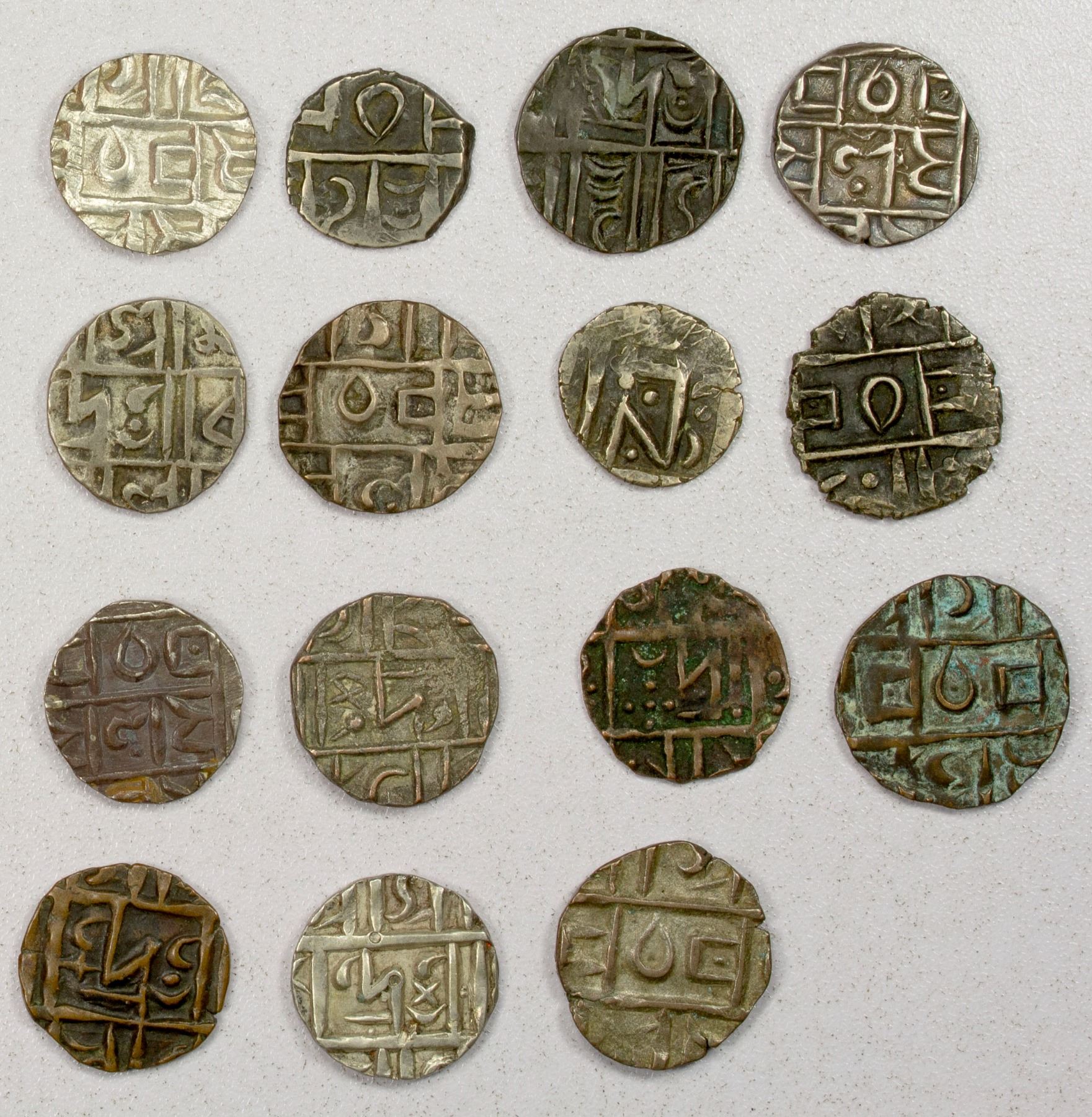 BHUTAN: LOT of 15 AR & AE debs, several different varieties, some with the letter sa, one with two fish; most struck better silver (one with testmarks), only 4 pieces in nearly pure copper; VF to EF conditions, most with decent surfaces; retail value $250, lot of 15 pieces.