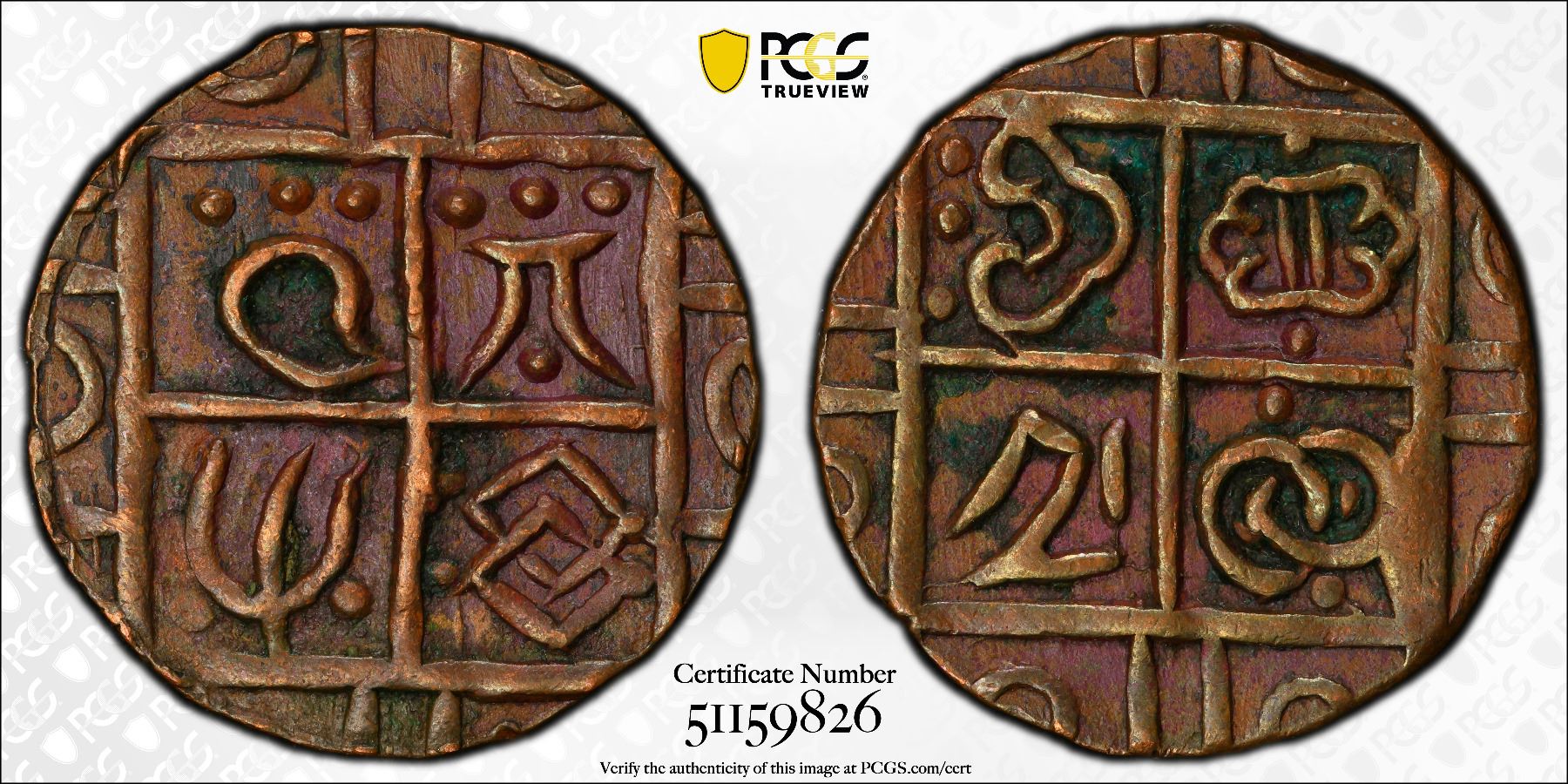 BHUTAN: Ugyen, 1907-1926, AE 1/2 rupee, ND (1910-27), KM-19a, environmental damage, PCGS graded AU Detail.