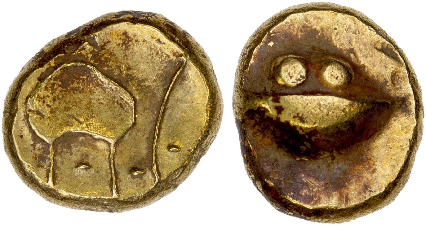 BIJAPUR: Anonymous, 17th century, AV pagoda (3.37g), G-BJ49, anepigraphic, allegedly male and female symbols; with consignor's description, XF, ex Ian Todd Collection.