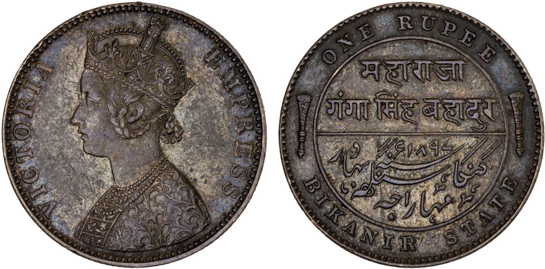 BIKANIR: Ganga Singhji, 1887-1942, AR rupee, 1897, KM-72, bust of Queen Victoria on the obverse; better date, choice XF.
