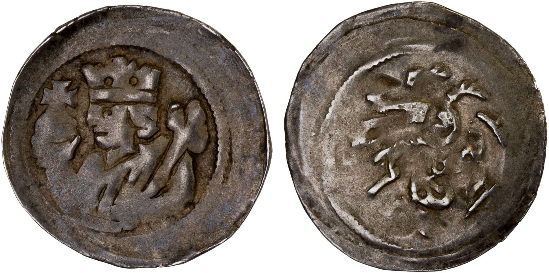 BOHEMIA: Ottokar II Premysl, 1253-1278, AR pfennig (0.79g), Prague, Bonhoff-2103, Cach-819, crowned bust of king left, holding globus cruiger and scepter // griffin rampant left, VF.