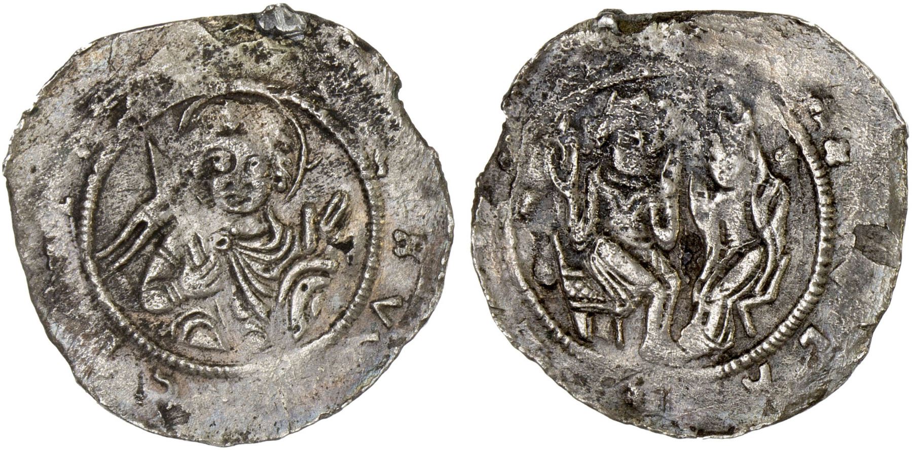 BOHEMIA: Vratislav II, 1061-1092, AR denar (0.68g), Praha (Prague), Frynas-B.16.29, Cach-615, struck as king after 1158, two crowned seated figures // portrait with halo and spear, VF.