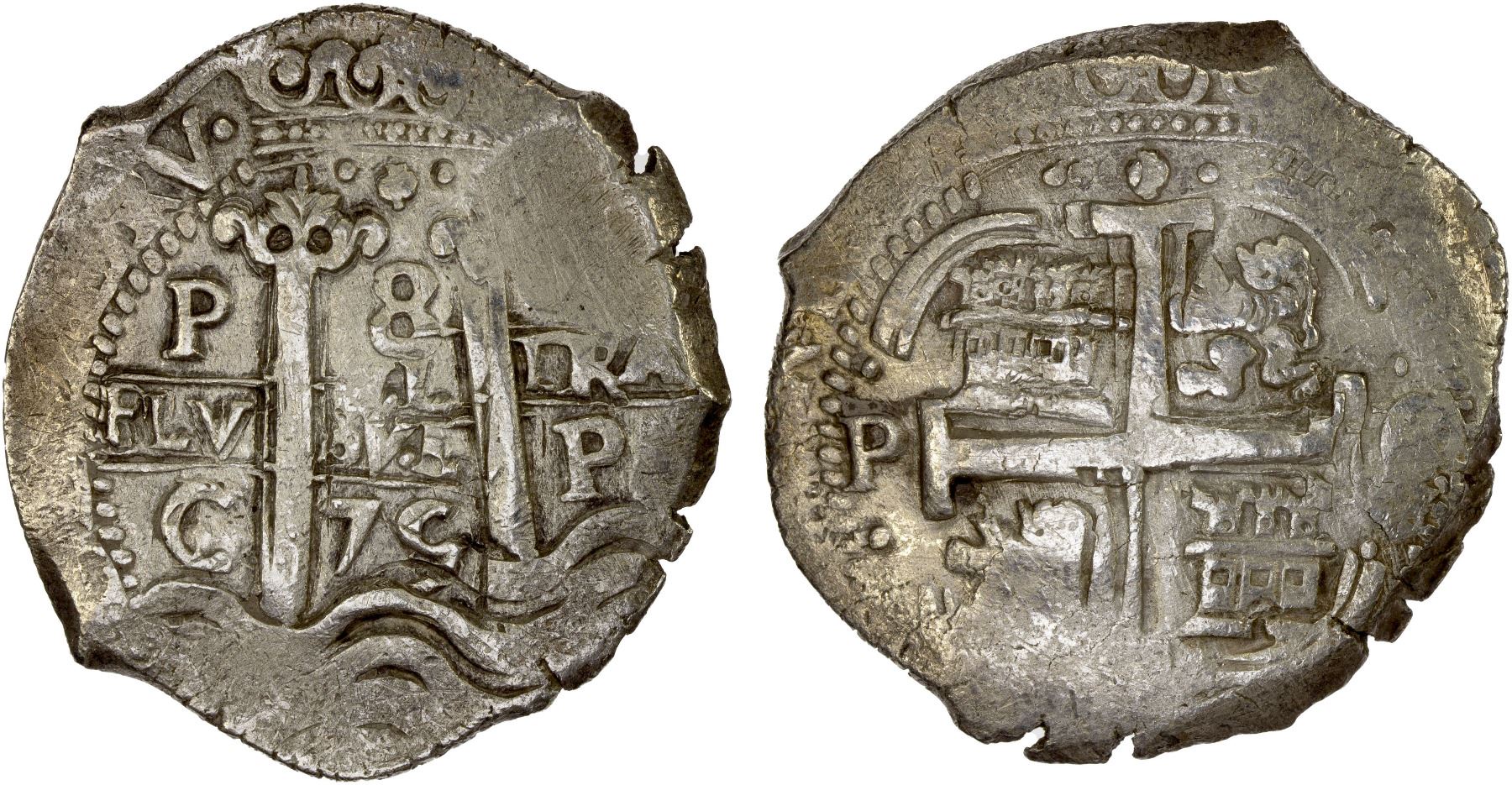 BOLIVIA: Carlos II, 1665-1700, AR 8 reales (26.22g), Potosí (16)79-P, KM-26, AC-714, assayer C, cob issue, three mintmarks, two assayers, one date, obverse double struck, XF.