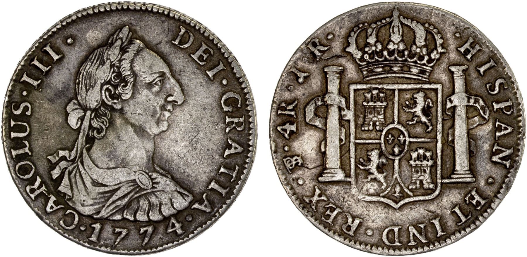BOLIVIA: Carlos III, 1759-1788, AR 4 reales, Potosí, 1774-PTS, KM-54, assayer JR, pleasing appearance, VF.