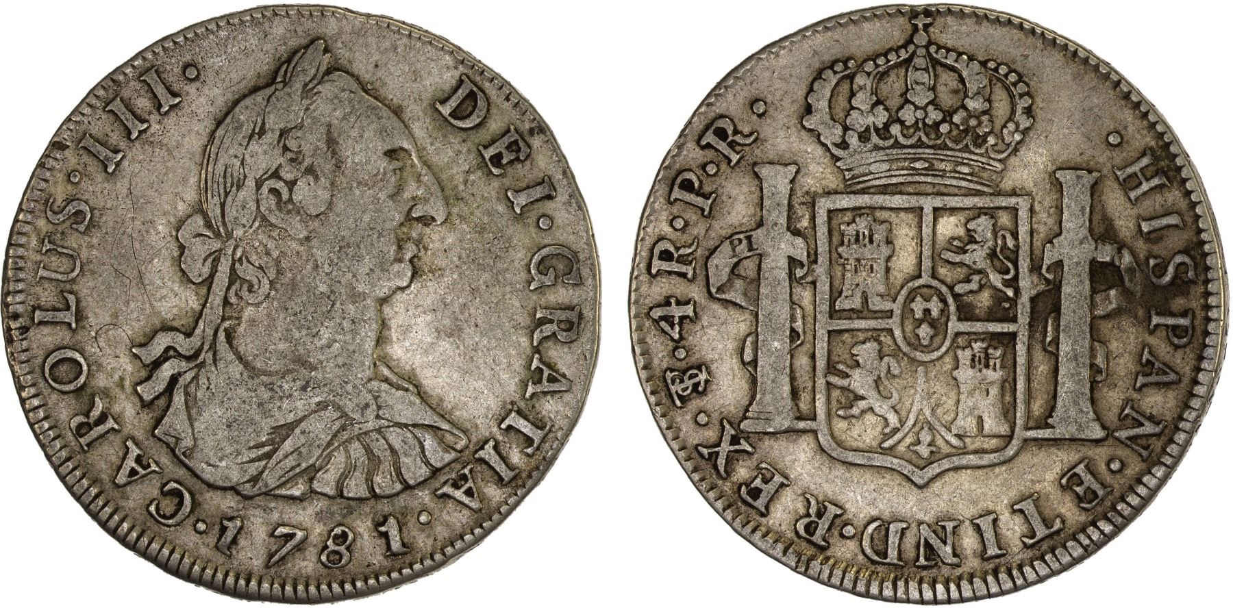 BOLIVIA: Carlos III, 1759-1788, AR 4 reales, Potosí 1781-PTS, KM-54, assayer PR, light obverse scratches, light reverse oxidation, VF