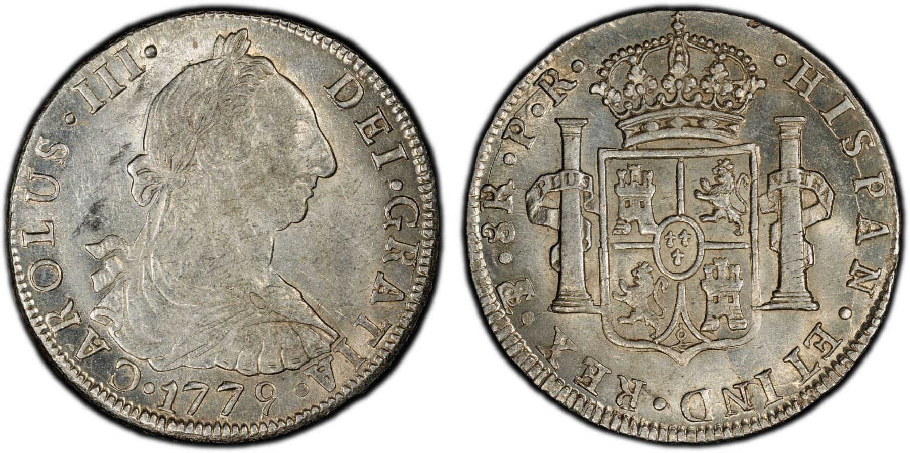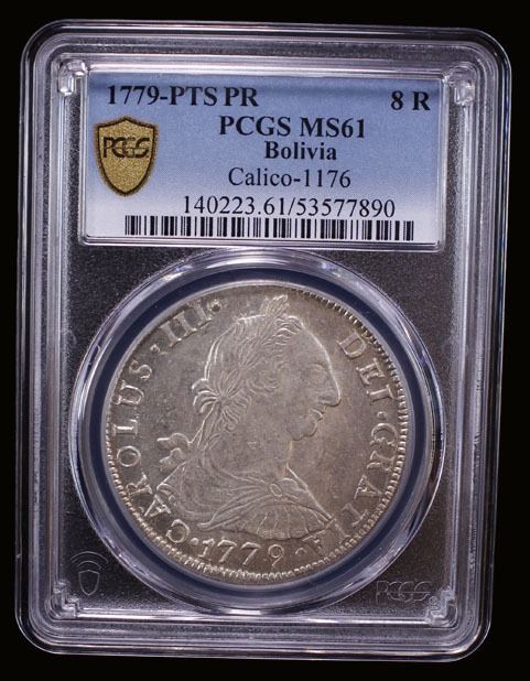 BOLIVIA: Carlos III, 1759-1788, AR 8 reales, Potosi, 1779-PTS, KM-55, El-19, assayer PR, very lustrous, better date, PCGS graded MS61.