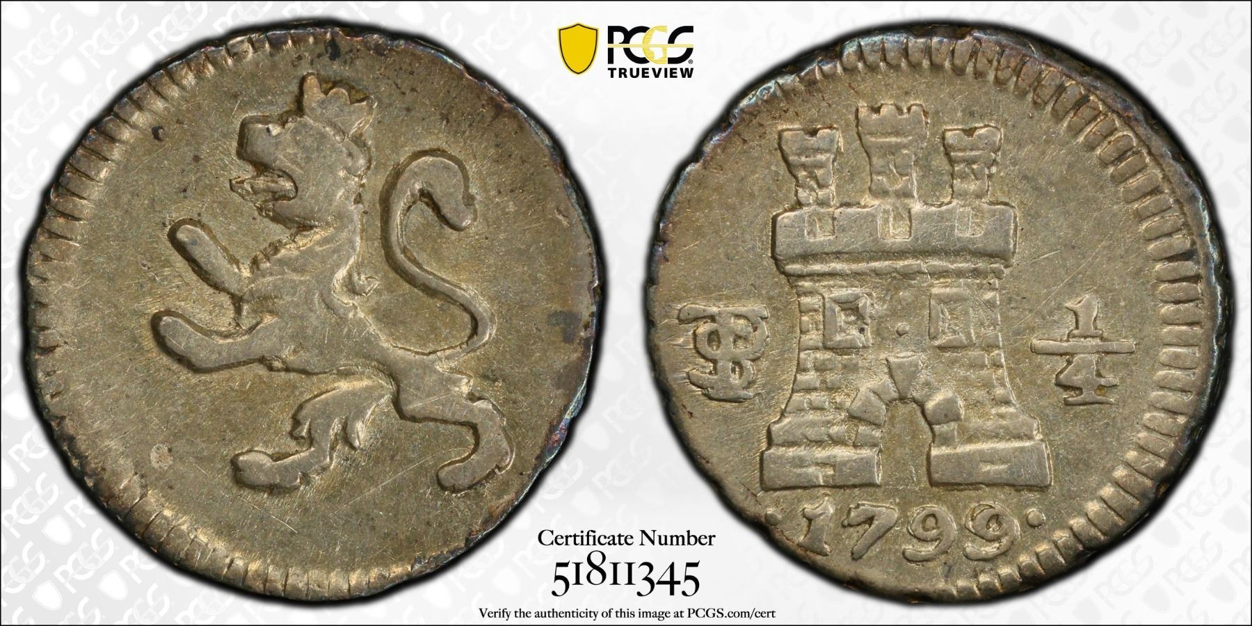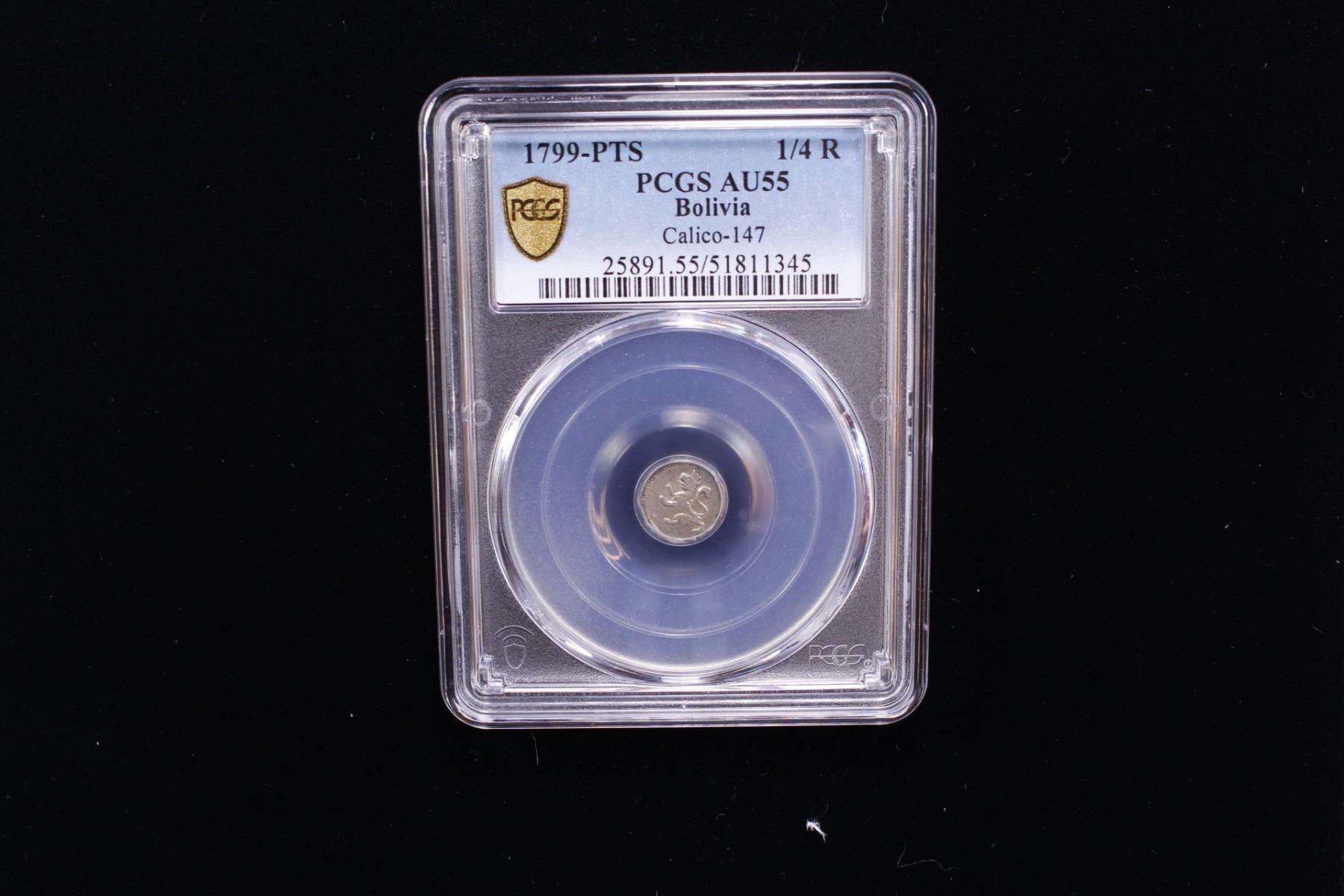 BOLIVIA: Carlos IV, 1788-1808, AR 1/4 real, 1799-PTS, KM-82, PCGS graded AU55, ex Almer H. Orr III Collection.