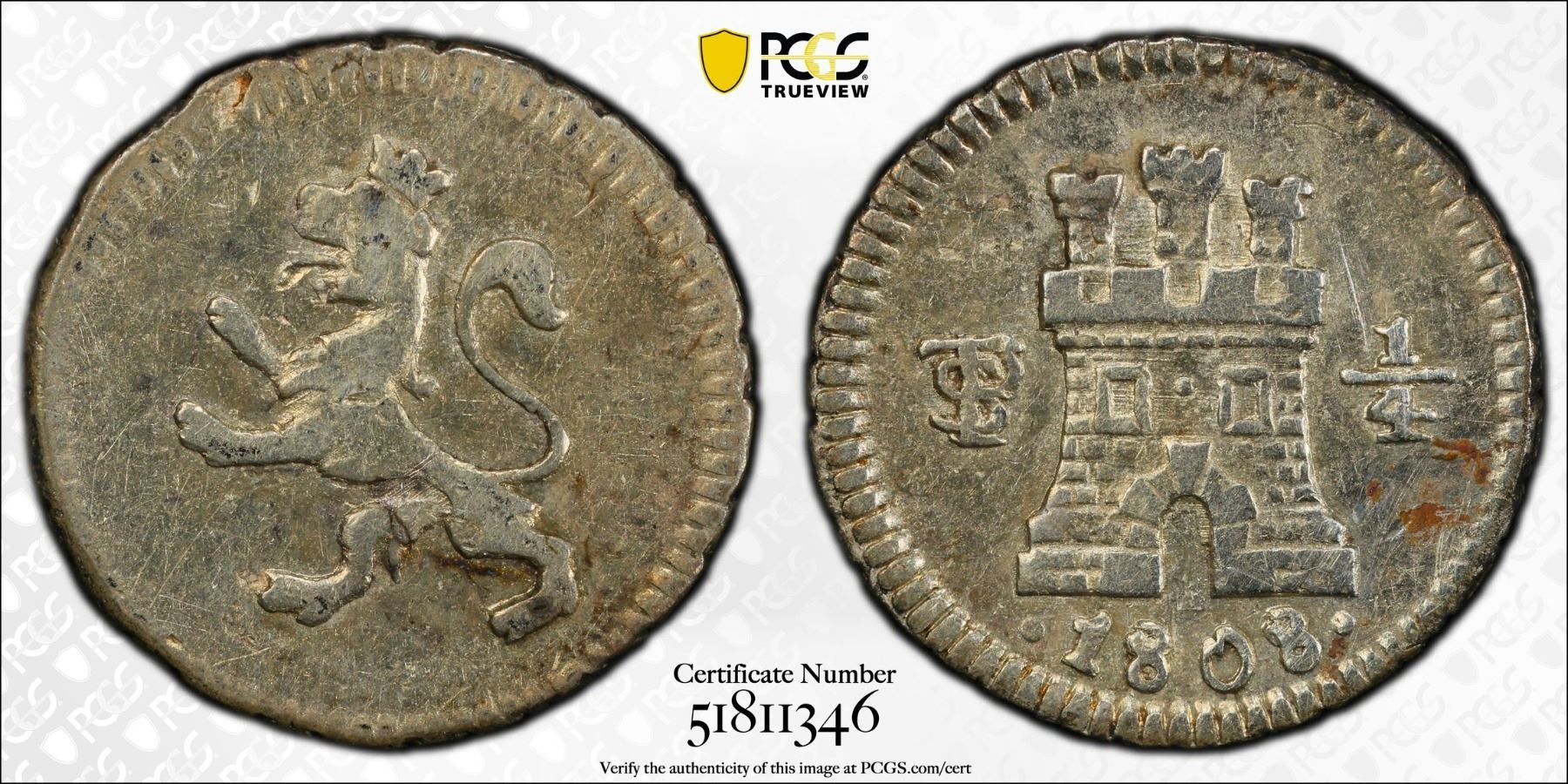 BOLIVIA: Carlos IV, 1788-1808, AR 1/4 real, 1808-PTS, PCGS AU53