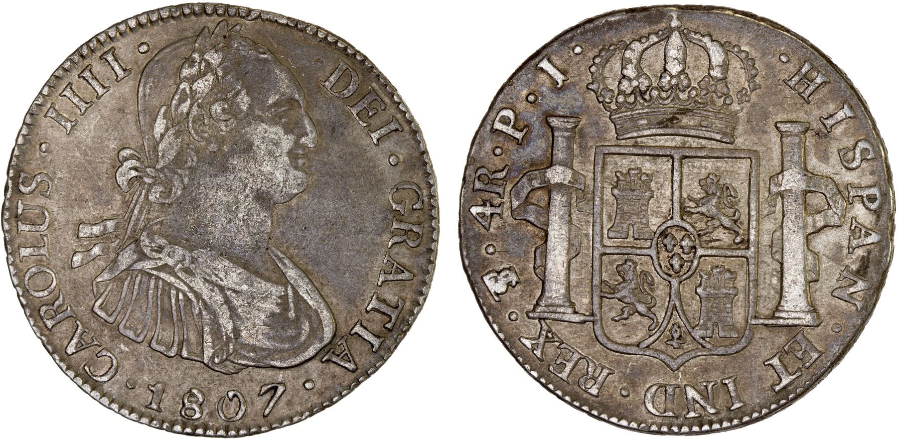 BOLIVIA: Carlos IV, 1788-1808, AR 4 reales, Potosí, 1807-PTS, KM-72, assayer PJ, some luster, toned, Choice VF.
