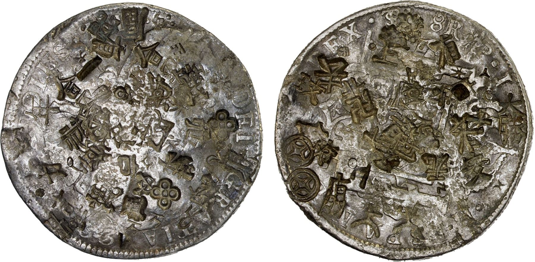BOLIVIA: Carlos IV, 1788-1808, AR 8 reales, Potosí 1803-PTS, KM-73, assayer PJ, with many Chinese merchant chopmarks (including a swastika) and a couple testmarks on both sides, VF.