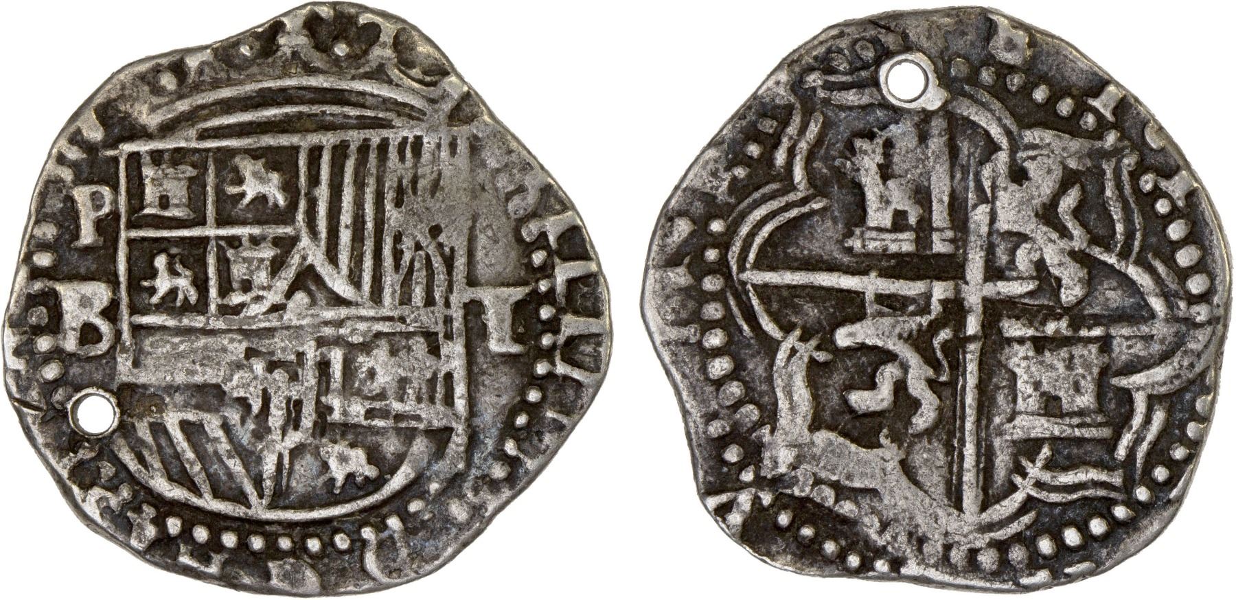 BOLIVIA: Felipe II, 1556-1598, AR 1 real (3.13g), ND (1574-86)-P, KM-2.2, assayer B, cob issue, full shield and cross, though a bit blundered by strike, small hole at 8:00, F-VF.