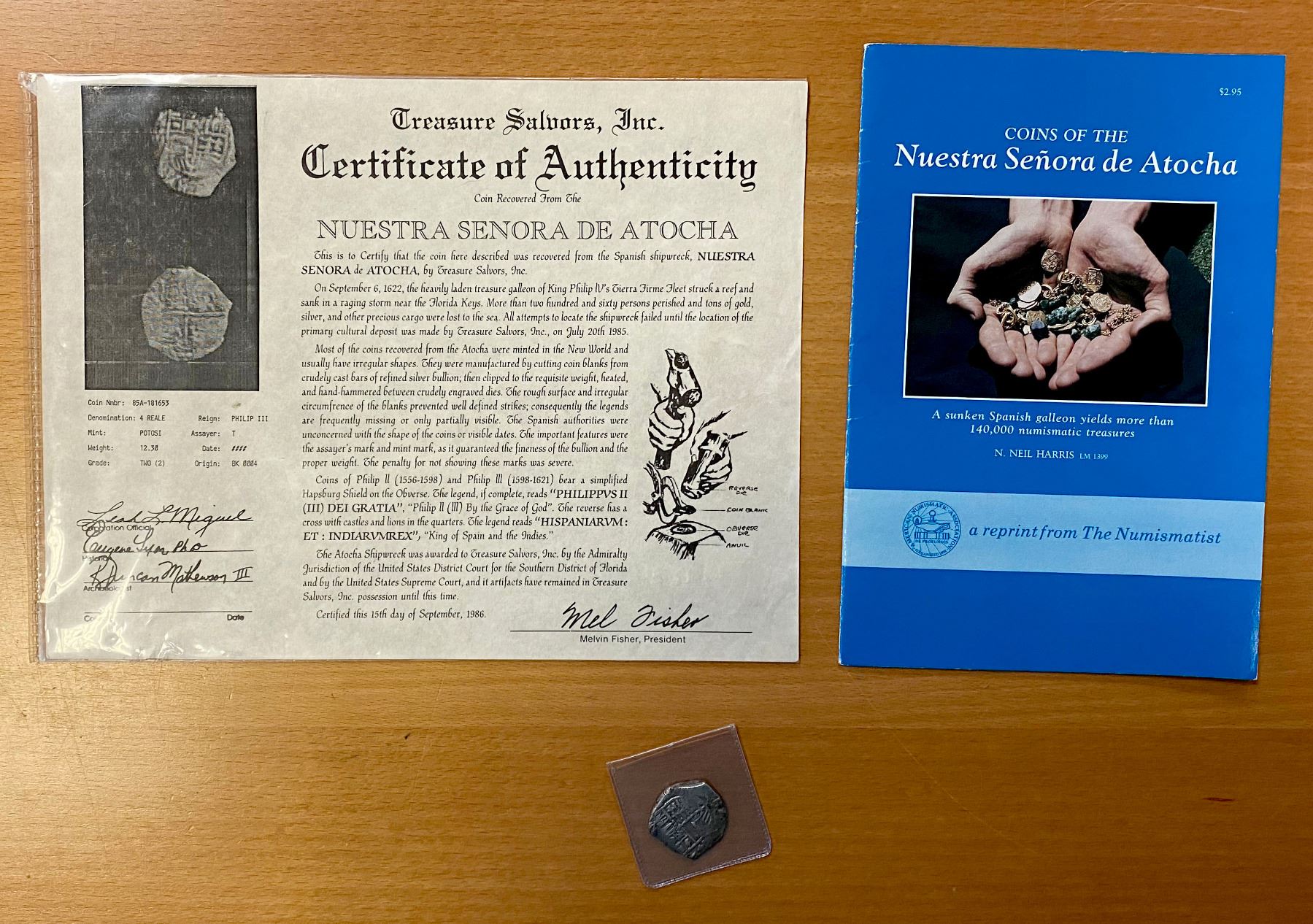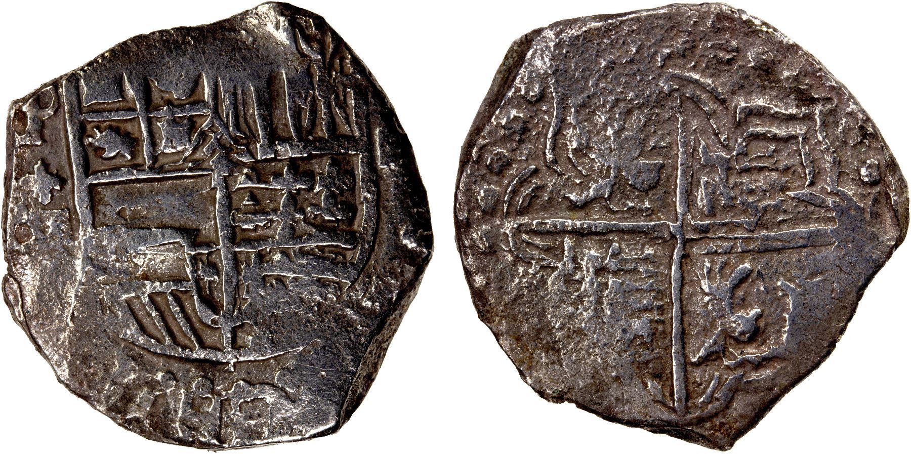 BOLIVIA: Felipe III, 1598-1621, AR 4 reales (12.30g), Potosi, ND-P, KM-9, assayer T, cob shipwreck find from the Atocha 1622 shipwreck west of Key West, Florida, moderate oxidation from saltwater immersion, with original Treasure Salvors certificate of authenticity 85A-181653 (Grade 2) (no tag) and booklet Coins of the Nuestra Señora de Atocha, VF, ex Nuestra Señora de Atocha shipwreck.
