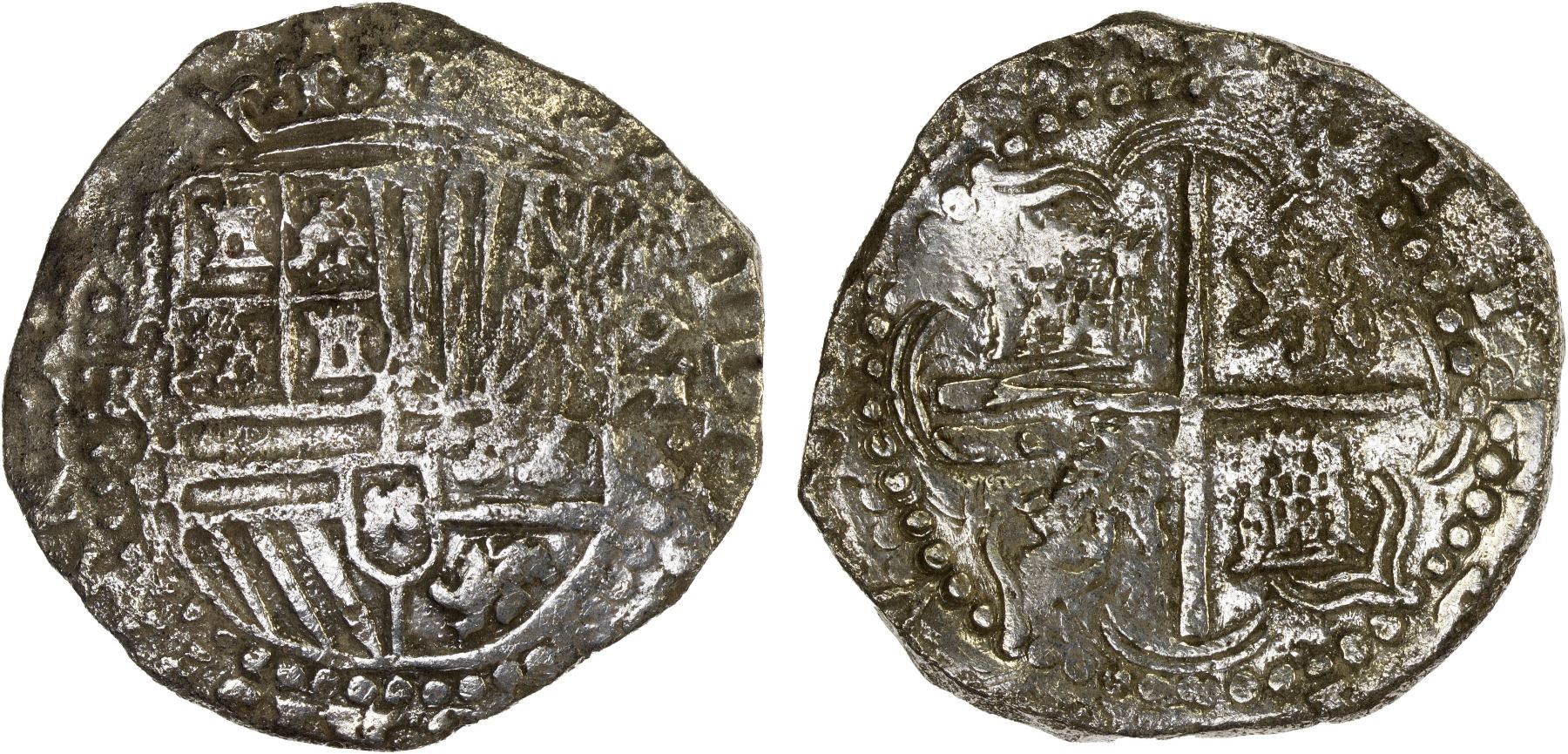 BOLIVIA: Felipe III, 1598-1621, AR 8 reales (23.40g), Potosi, DM, KM-10, cob coinage, assayer R; crowned arms // cross with lions and castles in the angles, recovered from the wreck of the Nuestra Señora de Atocha, with original Mel Fisher holder Grade 2, original Certificate of Authenticity, and black folder. On September 6, 1622, the heavily laden treasure galleon "Nuestra Senora de Atocha" of King Philip IV's Tierra Firme Fleet struck a reef and sank in a raging storm near the Florida Keys. More than two hundred and sixty persons perished and tons of gold, silver, and other precious cargo were lost to the sea. All attempts to locate the shipwreck failed until the location of the primary cultural deposit was made by Mel Fisher's Treasure Salvors, Inc., on July 20, 1985. The "Nuestra Senora de Atocha" carried over 200,000 hand-struck silver coins from mints in Potosi, Lima and Mexico City. Mel Fisher used a 5-point grading standard to assign a grade to each coin with Grade 1 the highest.