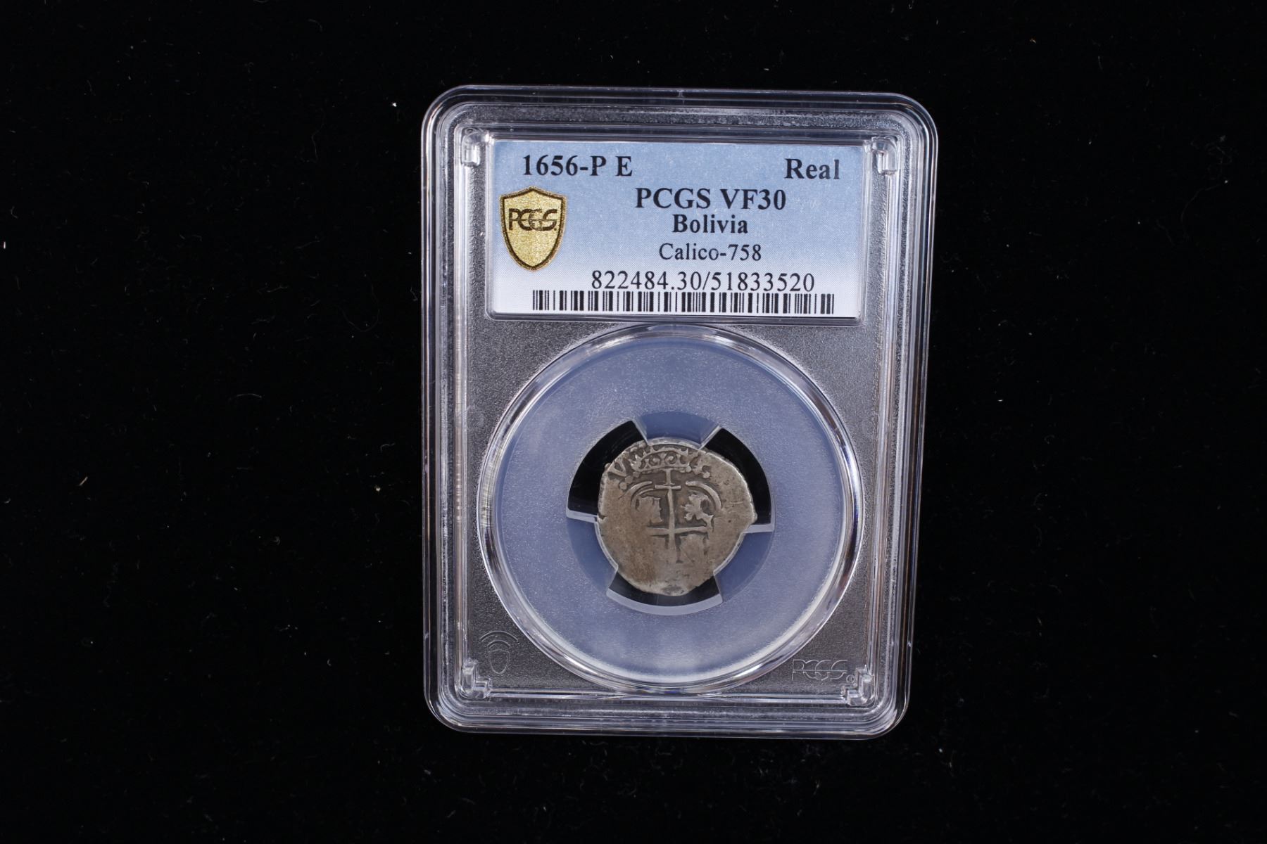 BOLIVIA: Felipe IV, 1621-1665, AR real cob, Potosi, 1656-P, KM-13, Cal-758, assayer E, PCGS graded VF30.