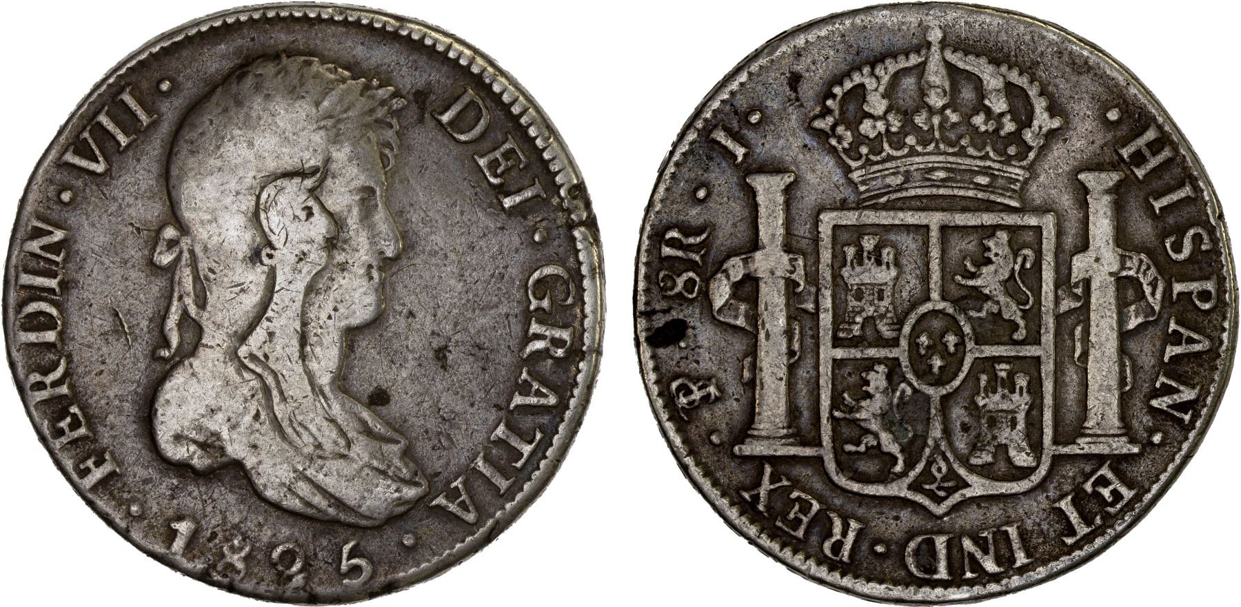 BOLIVIA: Fernando VII, 1808-1825, AR 8 reales, 1825-PTS, KM-84, assayer J, with an additional bust carved into the original bust, VF. These pieces seem to have been unofficially modified as love tokens or as a political statement. See Gurney (pp. 179-182) for similar examples.