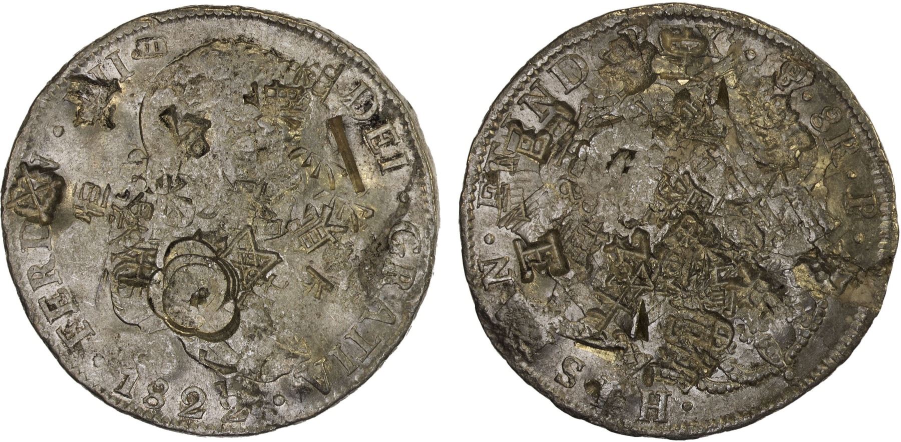 BOLIVIA: Fernando VII, 1808-1825, AR 8 reales, Potosí 1822-PTS, KM-84, assayer PJ, with many Chinese merchant chopmarks on both sides, light luster, XF to AU.