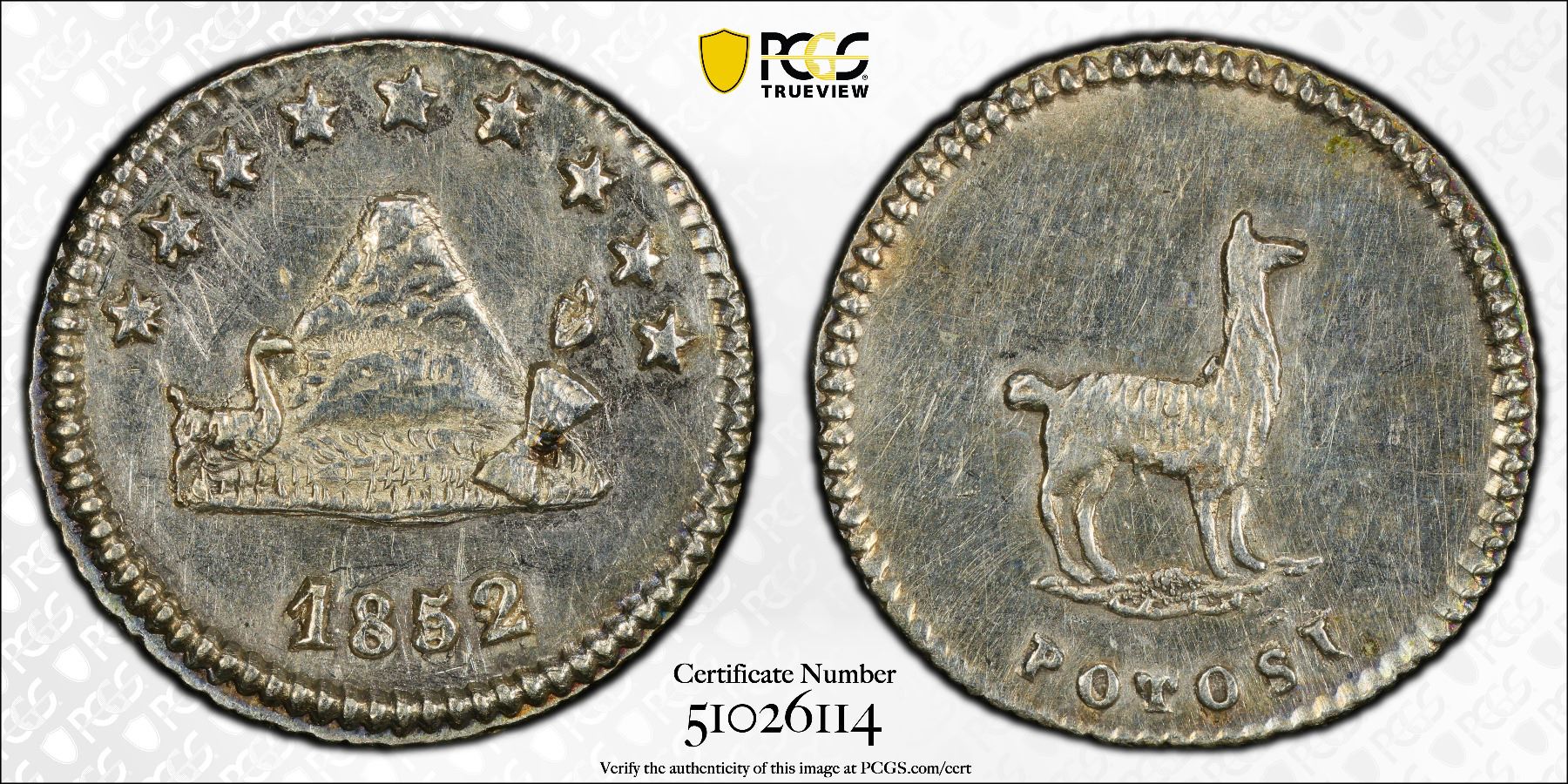BOLIVIA: Republic, AR 1/4 sol, Potosi, 1852, KM-111, a few light scratches, PCGS graded Unc, details.