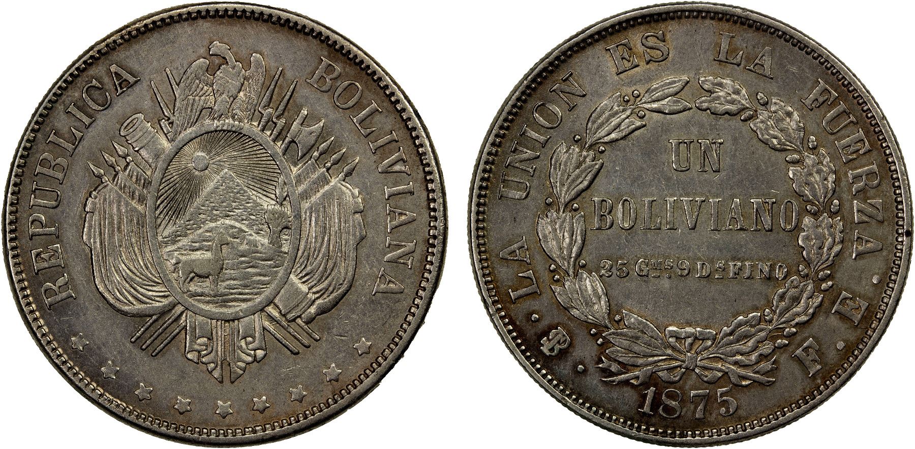 BOLIVIA: Republic, AR boliviano, 1875-PTS, KM-160.1, assayer FE, AU