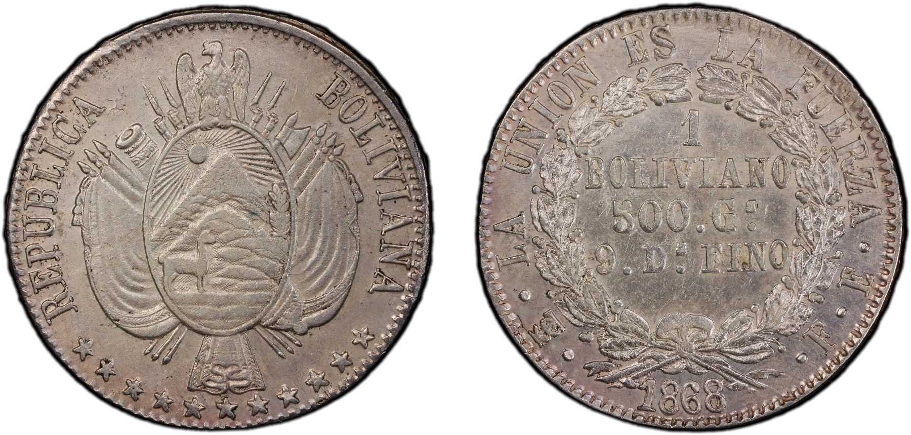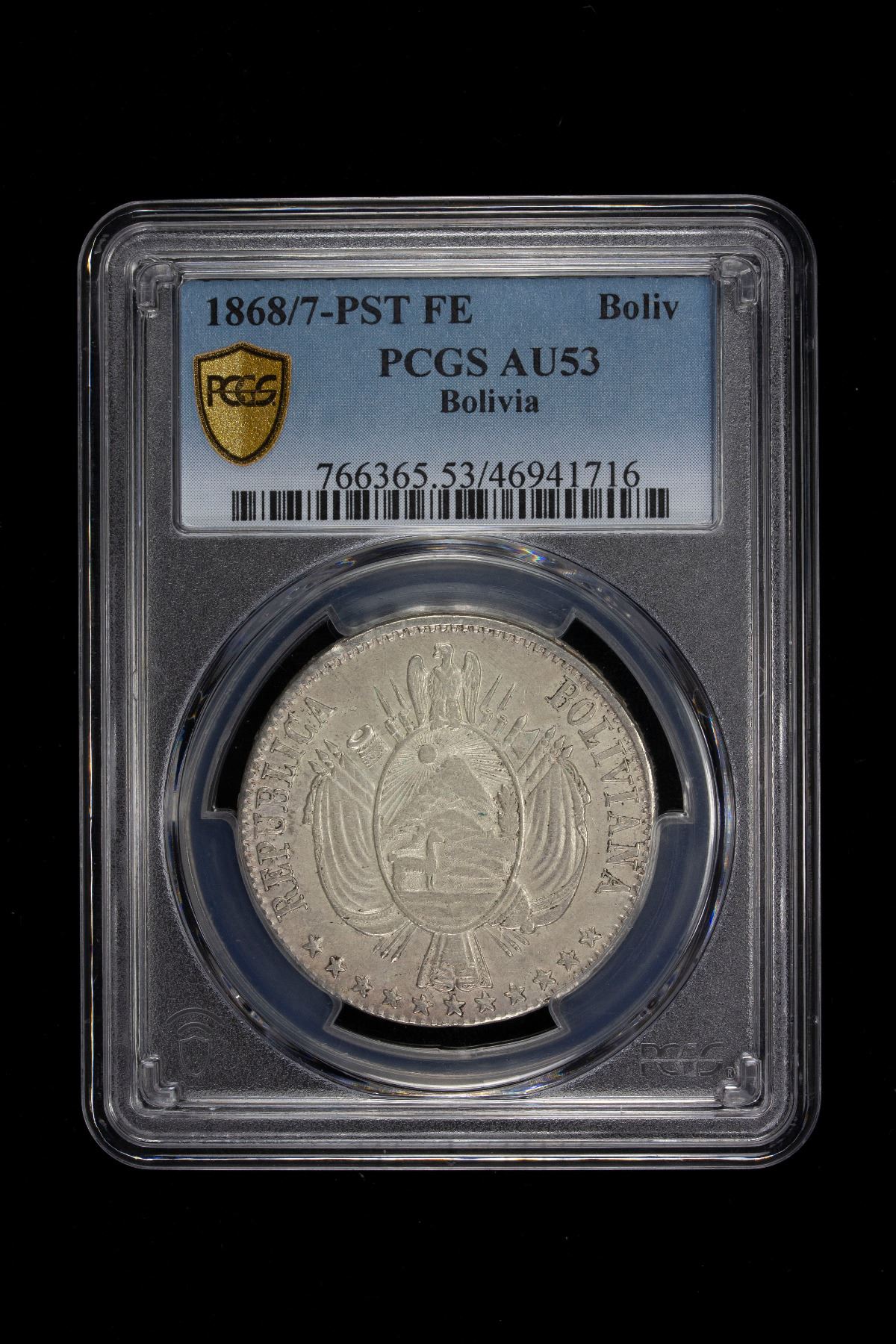 BOLIVIA: Republic, AR boliviano, Potosi, 1868/7-PTS, KM-152.2, assayer FE, lustrous fields, rare overdate, PCGS graded AU53.