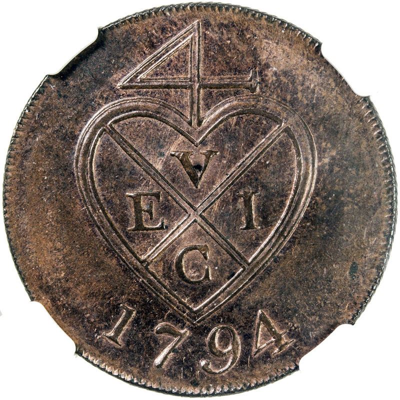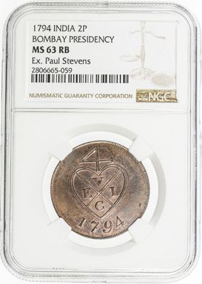 BOMBAY PRESIDENCY: AE 2 pice, [Soho mint], 1794, Stv-8.9, Prid-—. KM-196, type B/3 (no dot below V / short length pivot), NGC graded MS63 RB, R.
