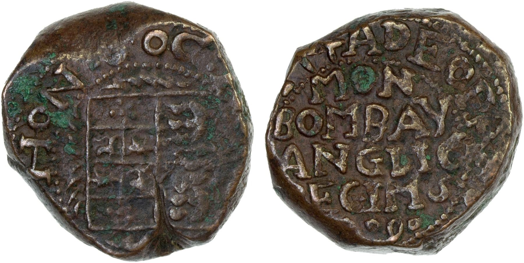 BOMBAY PRESIDENCY: AE copperoon (14.12g), [16]74 year 9, Stv-1.37, Prid-82, arms of the Honourable British East India Company // legend MON / BOMBAY / ANGLIC / REGIMS / Ao9o, attractive brown patina, VF-XF, ex Anton Holt Collection.