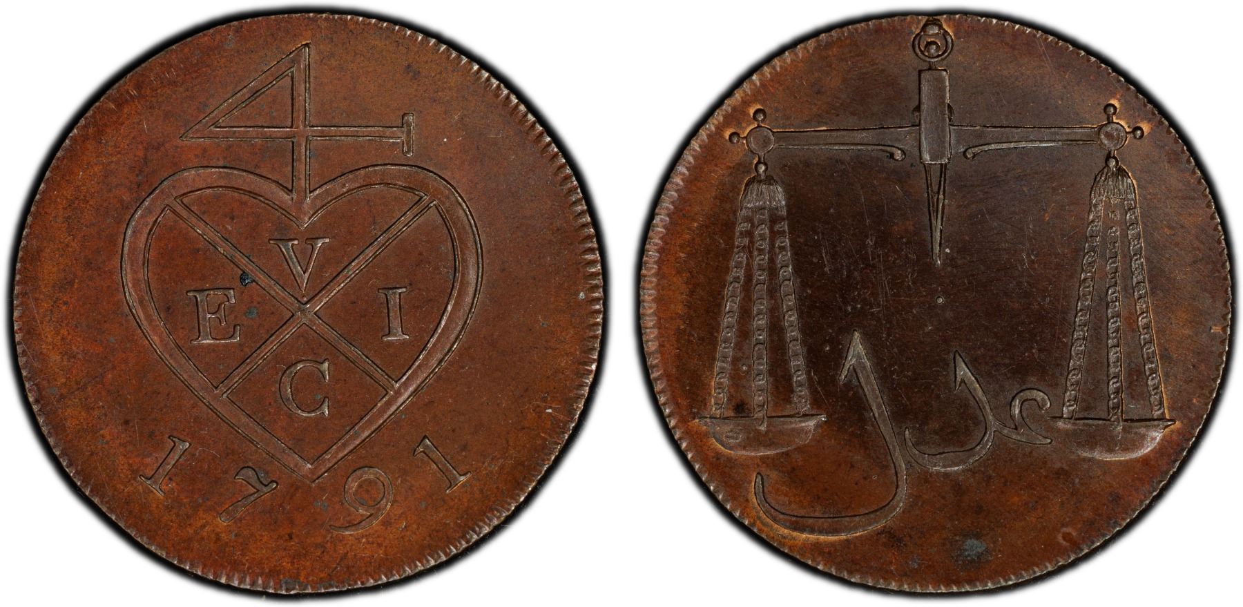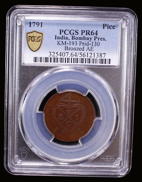 BOMBAY PRESIDENCY: AE pice, 1791, KM-193, Prid-130, East India Company proof issue, struck at Matthew Boulton's Soho Mint, Birmingham, mirror-like surfaces with chocolate-brown patina, PCGS graded Proof 64.