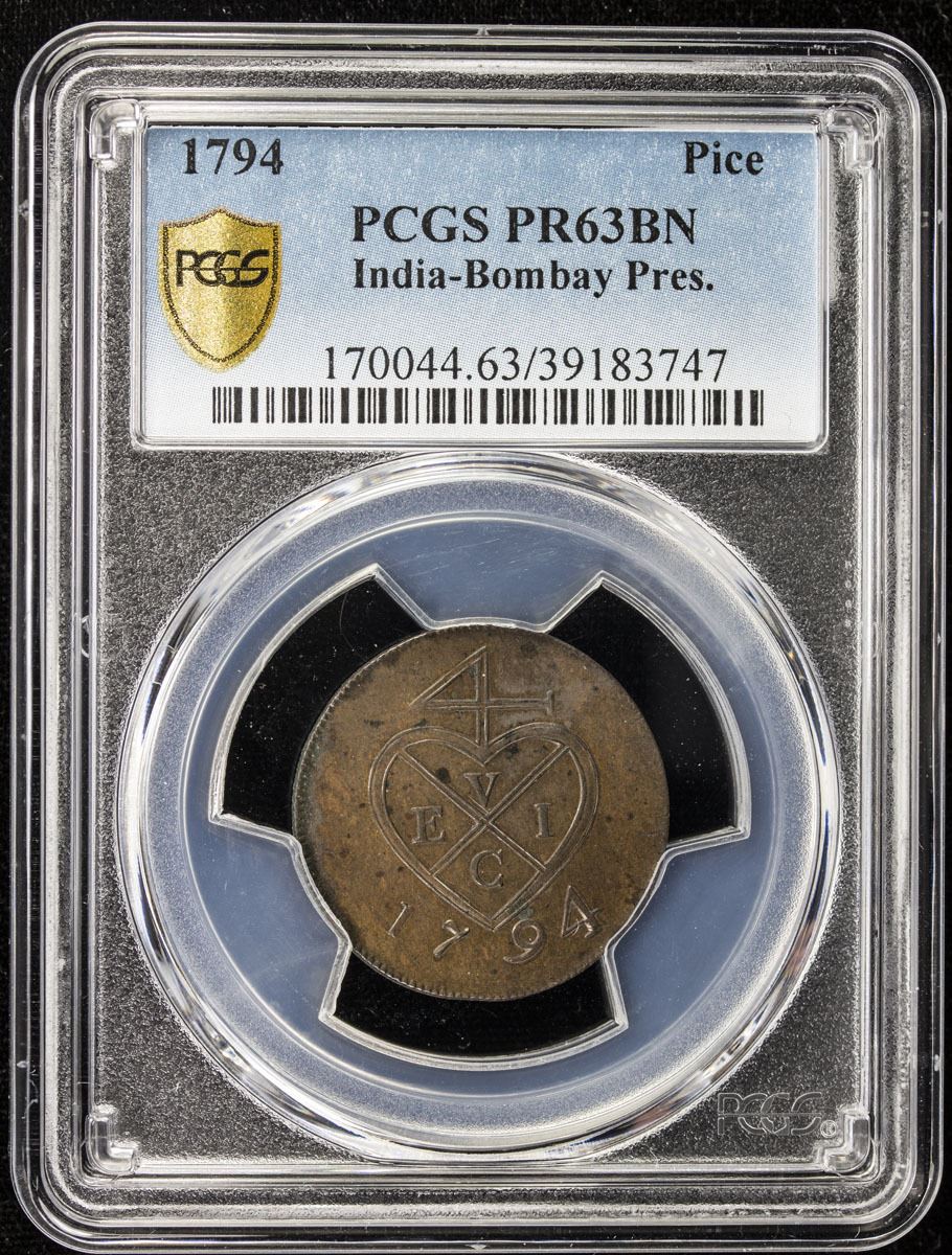 BOMBAY PRESIDENCY: AE pice, 1794, KM-193, East India Company issue, proof struck at Matthew Boulton's Soho Mint, Birmingham, PCGS graded PF63 BR.