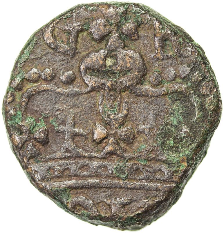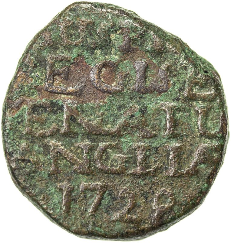 BOMBAY PRESIDENCY: AE pice (8.68g), Bombay, 1728, Stv-2.104, KM-165. Prid-104, large crown, GR above, BOMB below / the Company motto & date, lighly porous surfaces, Fine to VF, ex Paul Stevens Collection. In 1728, the old tin coins, almost always dated 1717, were presumably withdrawn and replaced by the copper coins, dated 1728-1739 (and 1749, perhaps an engraver's error), after which they were replaced by the tutanag coinage commencing in 1741.