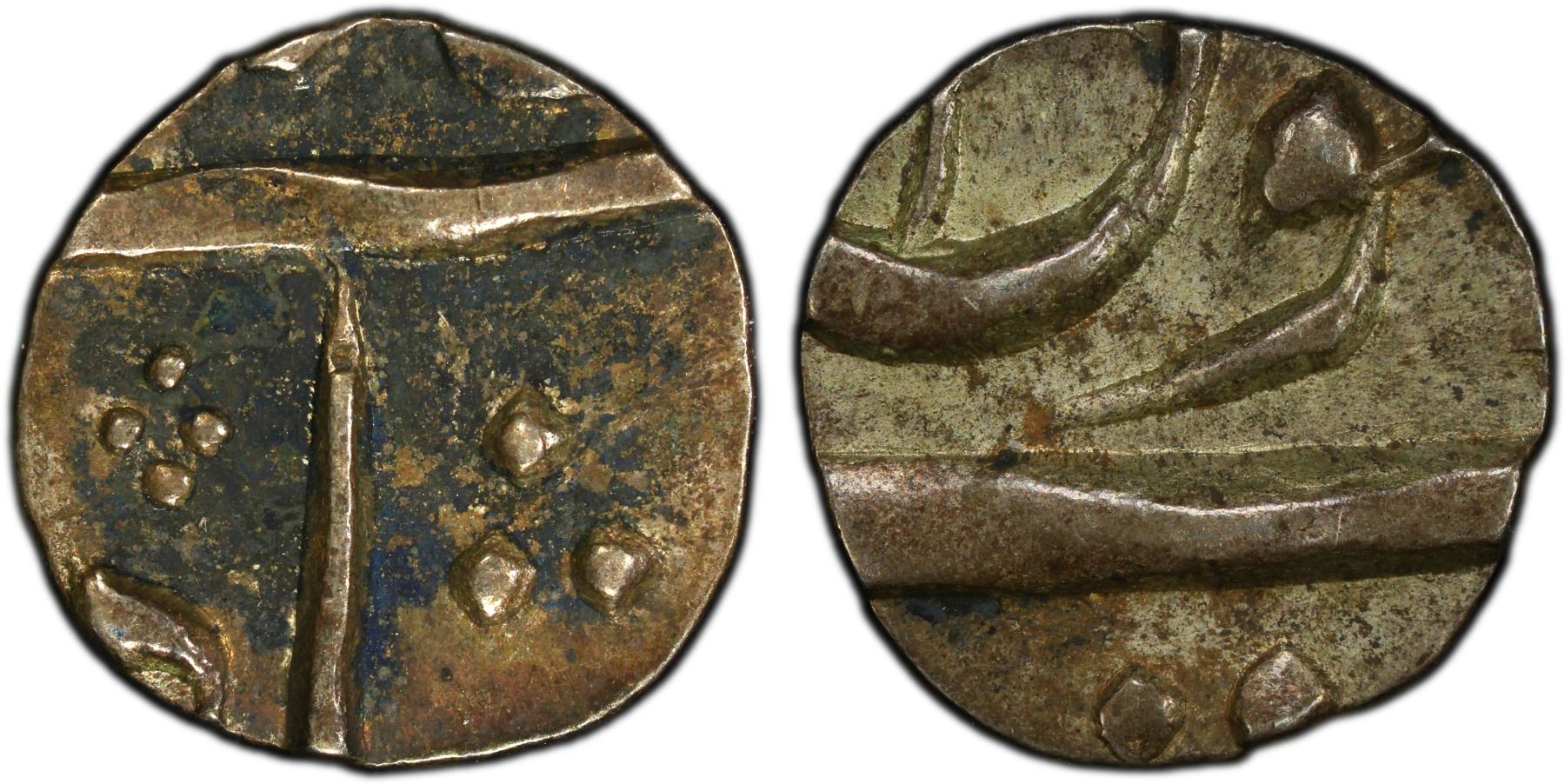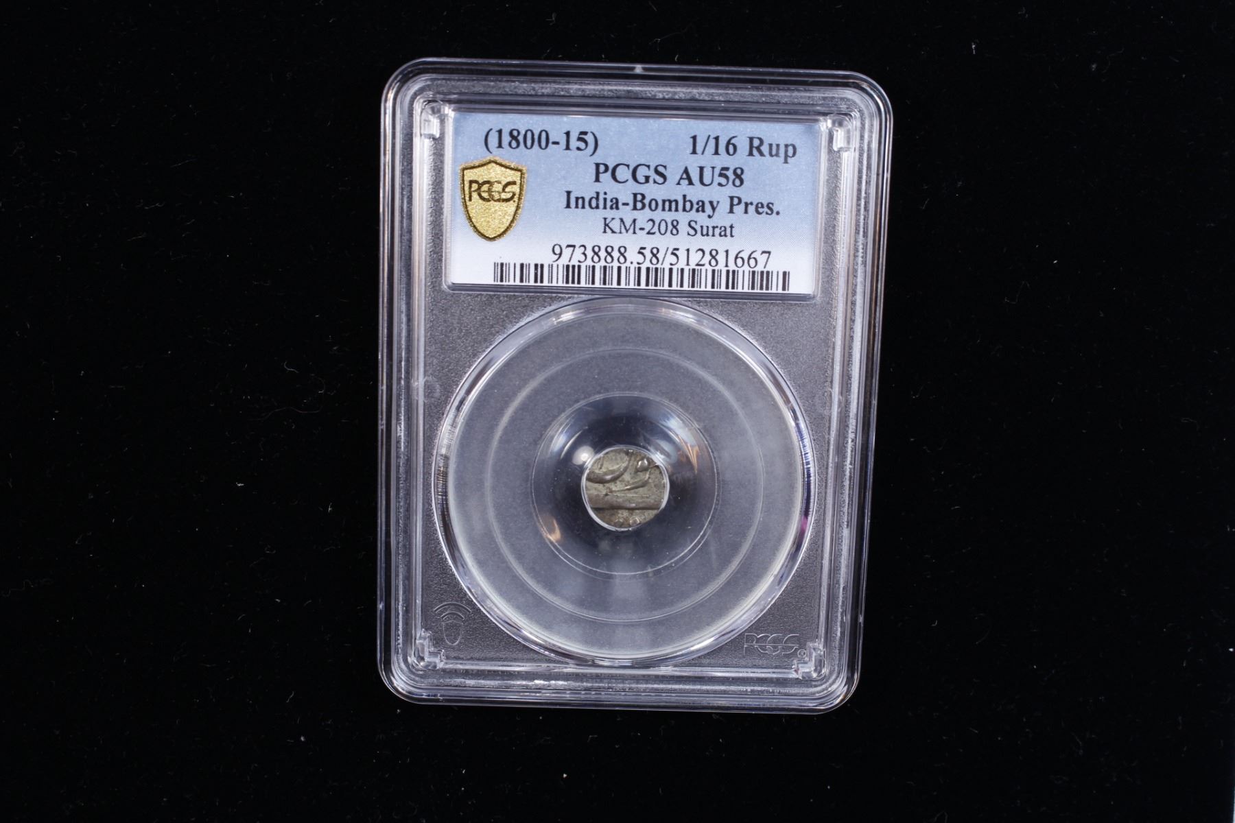 BOMBAY PRESIDENCY: AR 1/16 rupee (0.71g), Surat, ND, KM-208, East India Company issue in the name of the Mughal Emperor Shah Alam II, struck 1800-15, an attractive nearly mint state example, PCGS graded AU58. This is incredibly rare and the first example that we have offered since 2011. There are no other examples listed on CoinArchives. This is the only example on the PCGS population report.