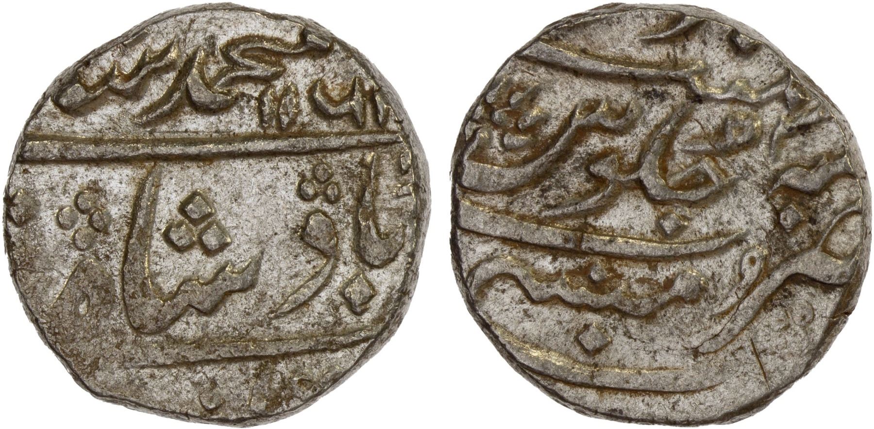BOMBAY PRESIDENCY: AR rupee (11.57g), Munbai, AH1161 year 3x, KM-163, East India Company issue in the name of Muhammad Shah, lustrous, XF-AU.