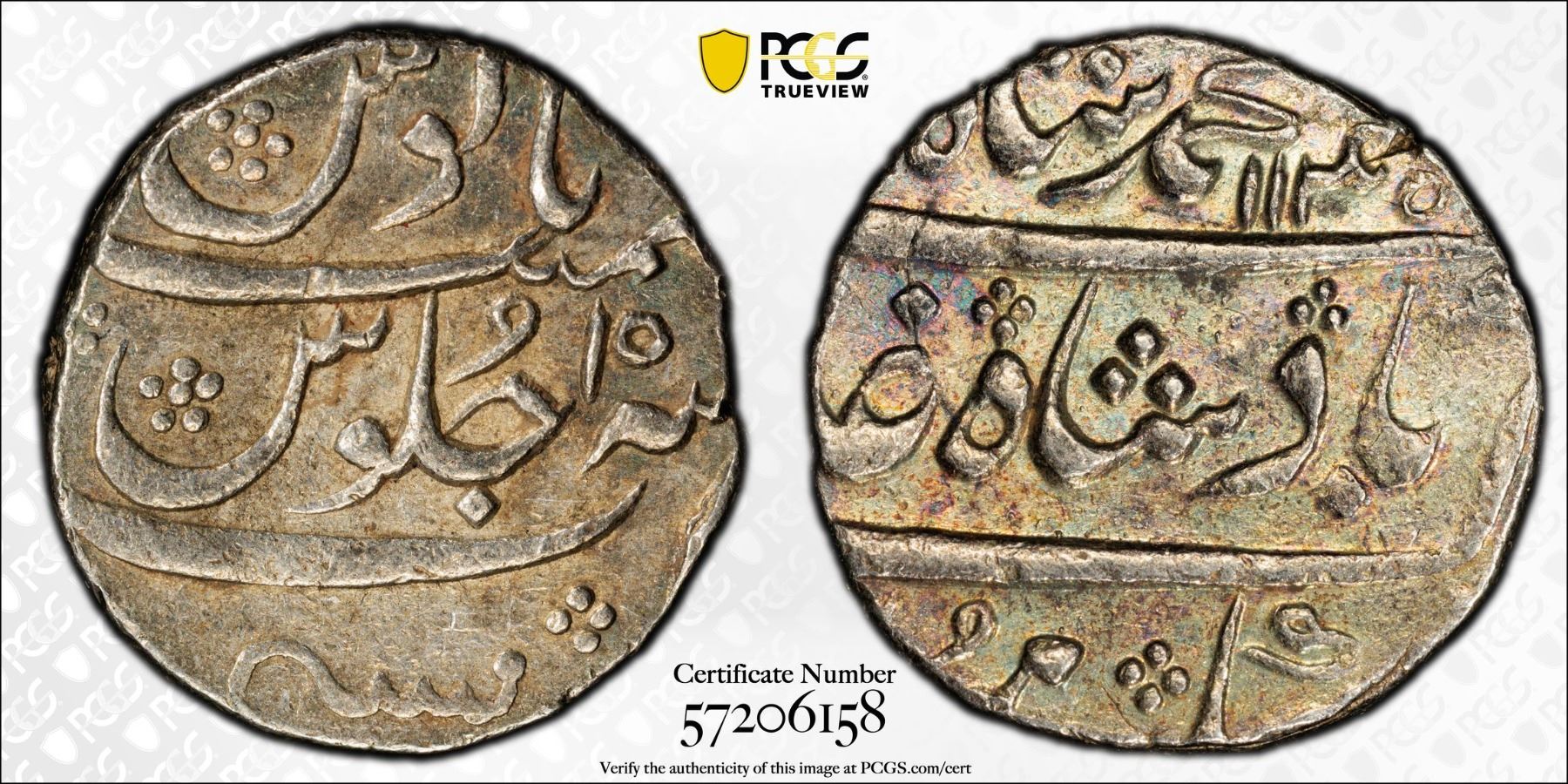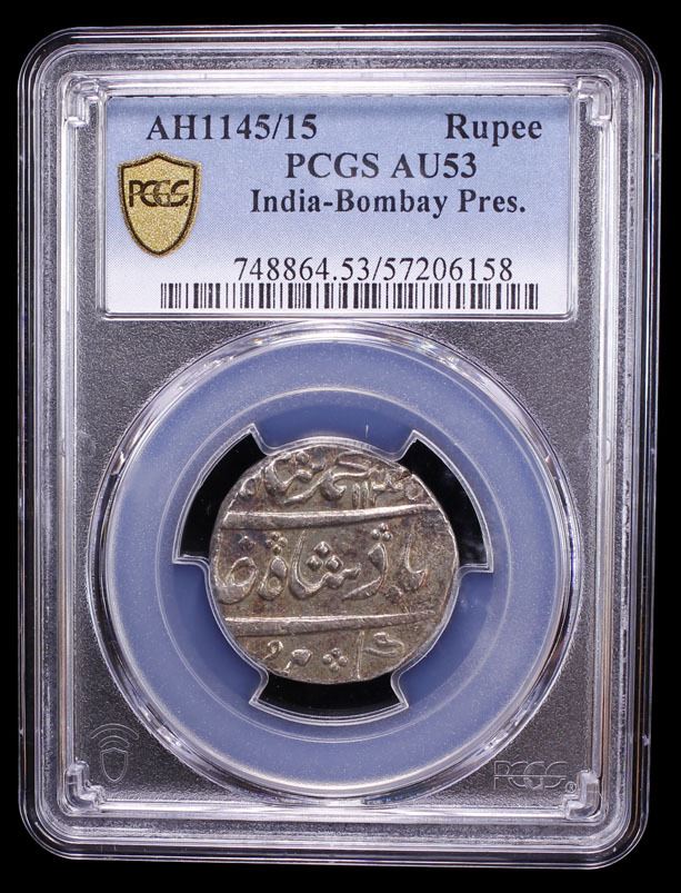 BOMBAY PRESIDENCY: AR rupee (11.62g), AH1145 year 15, KM-163, in the name of Muhammad Shah, lustrous, PCGS graded AU53.