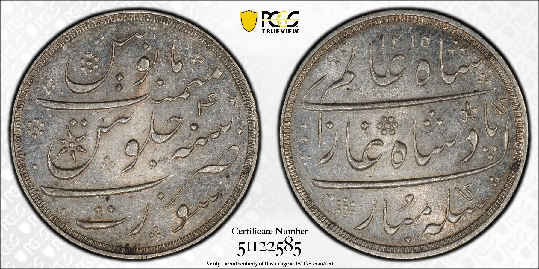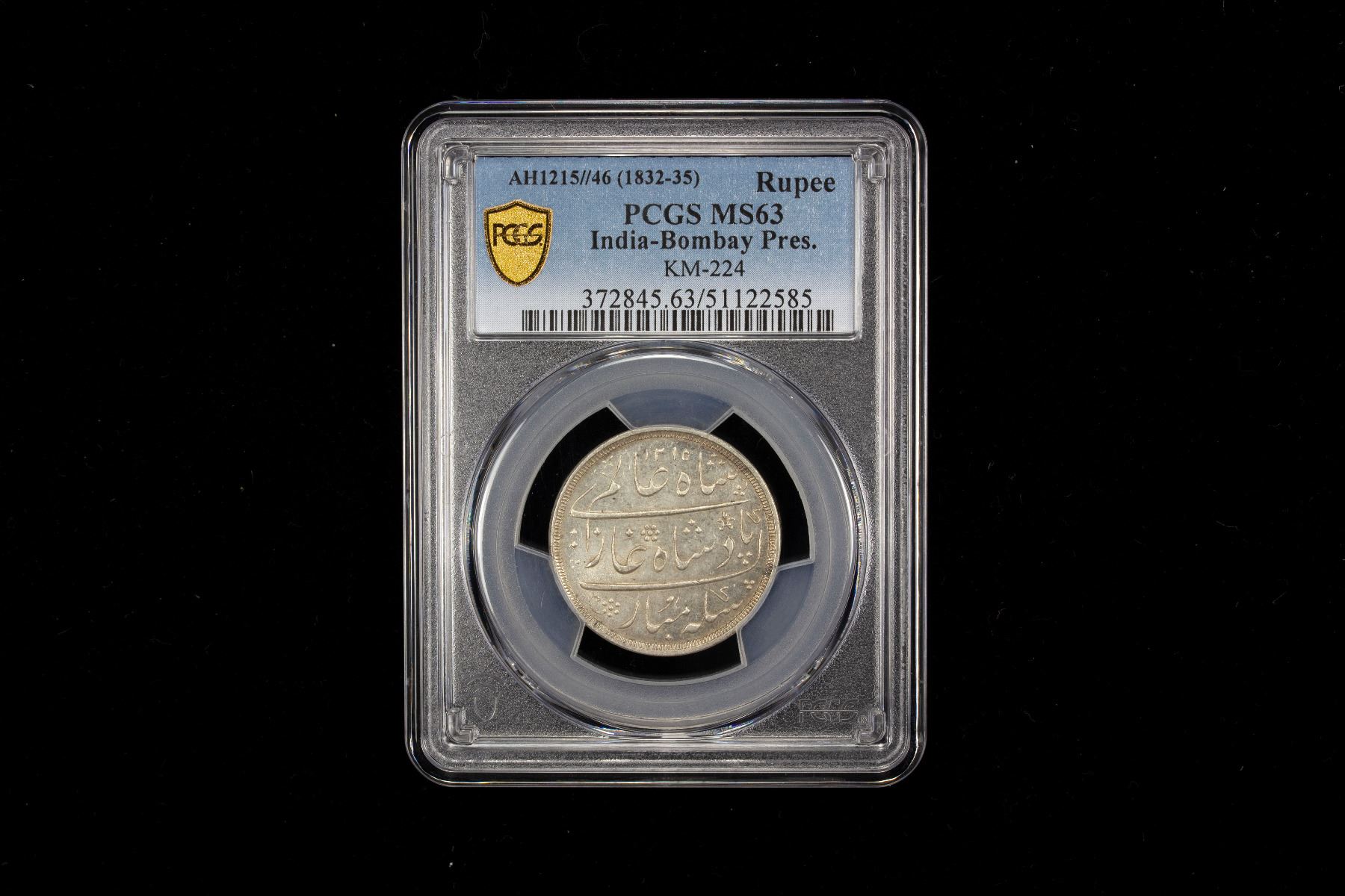 BOMBAY PRESIDENCY: AR rupee, Surat, AH1215 year 46, KM-224, East India Company issue,struck 1832-35 at the new Bombay mint, a lovely mint state example! PCGS graded MS63. The coins were declared legal tender by Procalmation dated 17 October 1832. Coinage of this new improved silver money continued at the Bombay mint until December 1835, when the Company's standard rupee currency with regal portrait replaced it.