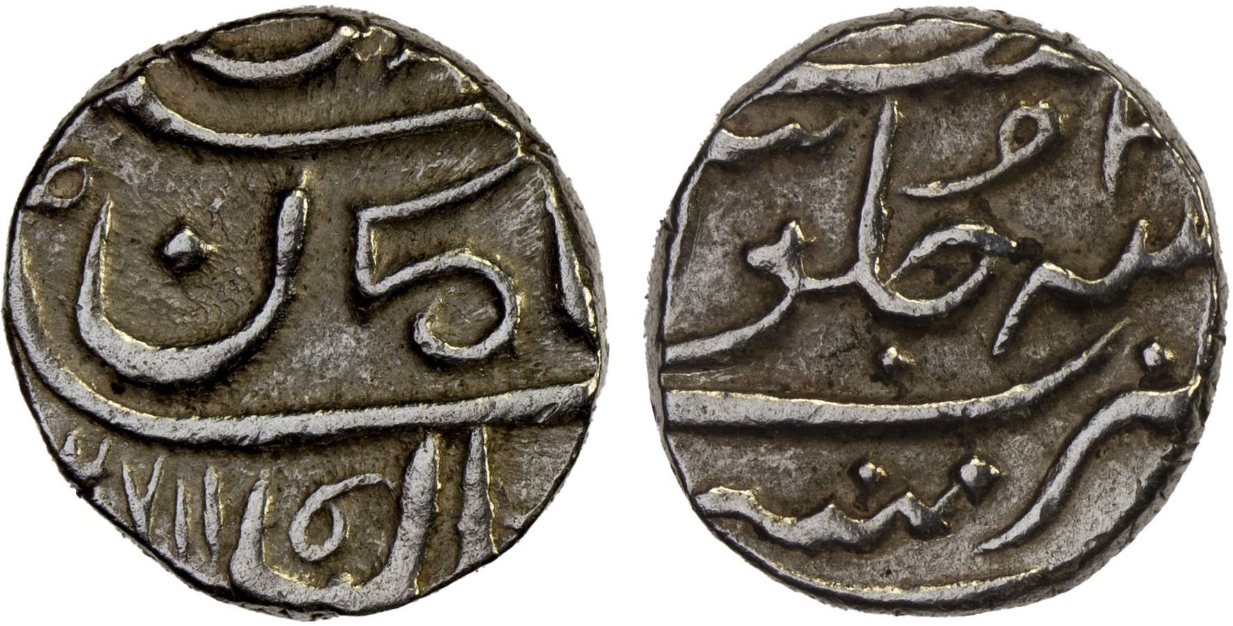 BOMBAY PRESIDENCY: Malabar Coast: AR 1/5 rupee (2.31g), Munbai, AH1172 (retrograde), KM-272, Stv-p. 315., stylized obverse legend derived from Shah Jahan II, vertical number "5" in the obverse center, regnal year "2" on the reverse, XF, RRR. Unpublished date, though another example from the same dies was sold in Noonans auction 268, lot 357 (date misread as 1174). The type was introduced in the year AH1131 which would have been during the short reign of Shah Jahan II, with the stylized obverse continued for all examples with the horizontal or inverted number 5 in the obverse center.