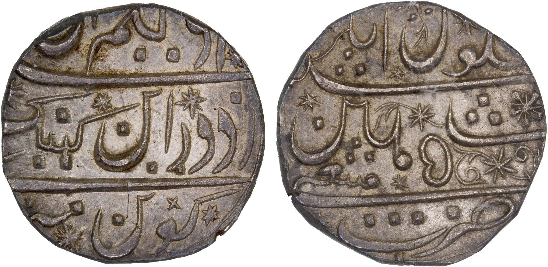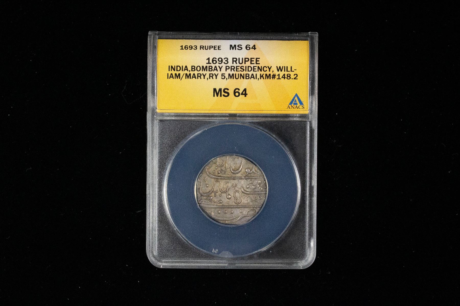 BOMBAY PRESIDENCY: William & Mary, 1689-1694, AR rupee, Munbai, year 5 (= 1693), Stv-1.26, Prid-27. KM-148.2, with Persian legends that translate as "coin struck during the reign of King William and Queen Mary" // "struck at Bombay in the auspicious year 5 of the English rulers"; fabulous bold strike with beautifully toned luster, especially on the obverse; at MS64, this grade is higher than any examples of the three known dates (4, 5, 6) filed on CoinArchives, ANACS graded MS64, RRR. Only one example of year 5 and graded uncirculated is filed on CoinArchives, sold in the Noonans Auction 268, lot 334 (2023), graded MS61.