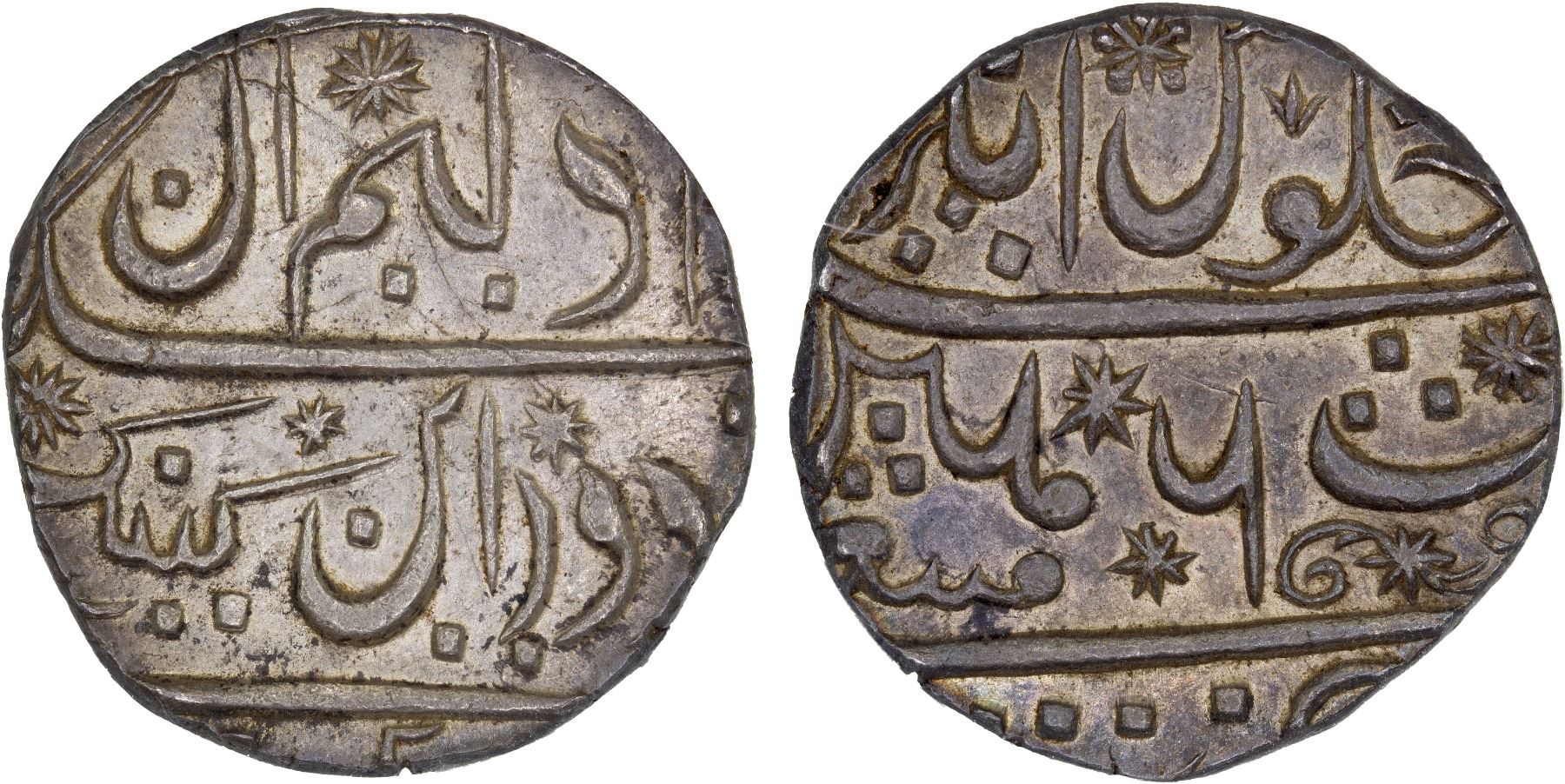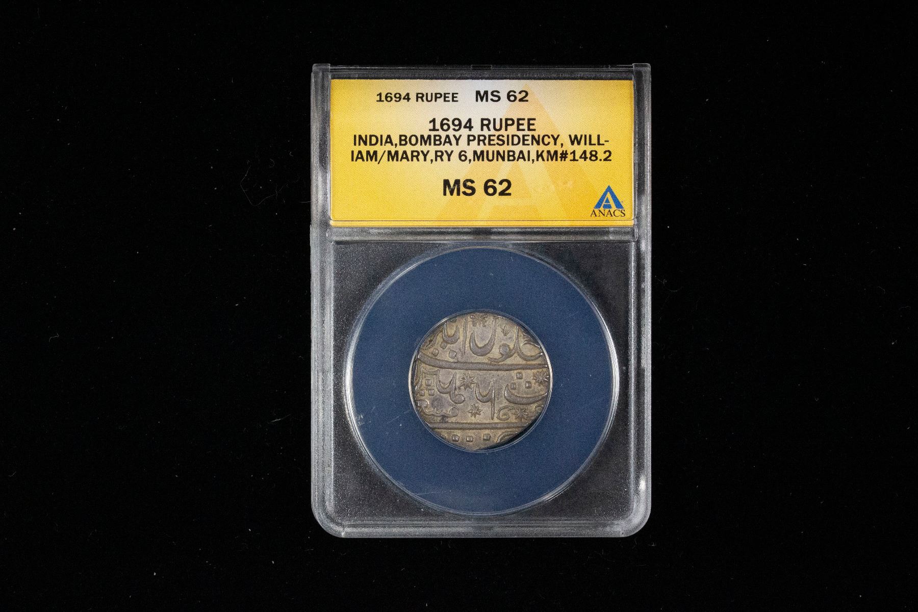 BOMBAY PRESIDENCY: William & Mary, 1689-1694, AR rupee, Munbai, year 6 (= 1694), Stv-1.30, Prid-28. KM-148.2, with Persian legends that translate as "coin struck during the reign of King William and Queen Mary" // "struck at Bombay in the auspicious year 6 of the English rulers", with differentiating mark 4; magnificent strike, some of the original luster still visible; at MS62, this piece ties the two other examples also graded MS62 (years 4, 5, 6), the highest grade filed on CoinArchives, ANACS graded MS62, RRR. There are only 2 uncirculated examples of year 6 filed on CoinArchives, both graded MS62, sold in 2018 & 2023.
