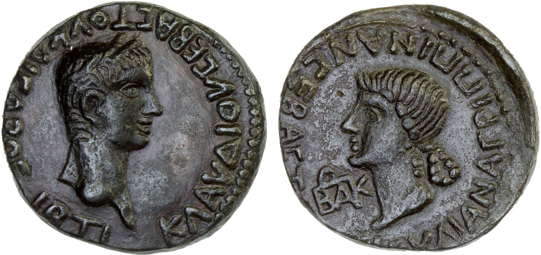 BOSPOROS: Kotys I, ca. 45-68 AD, AE21 (4.89g), 49-54 AD, RPC-1925, MacDonald-326, in the name of the Roman Emperor Claudius and the Augusta Agrippina, laureate bust of Claudius right // head of Agrippina left, monogram to left, heavy smoothing, VF.