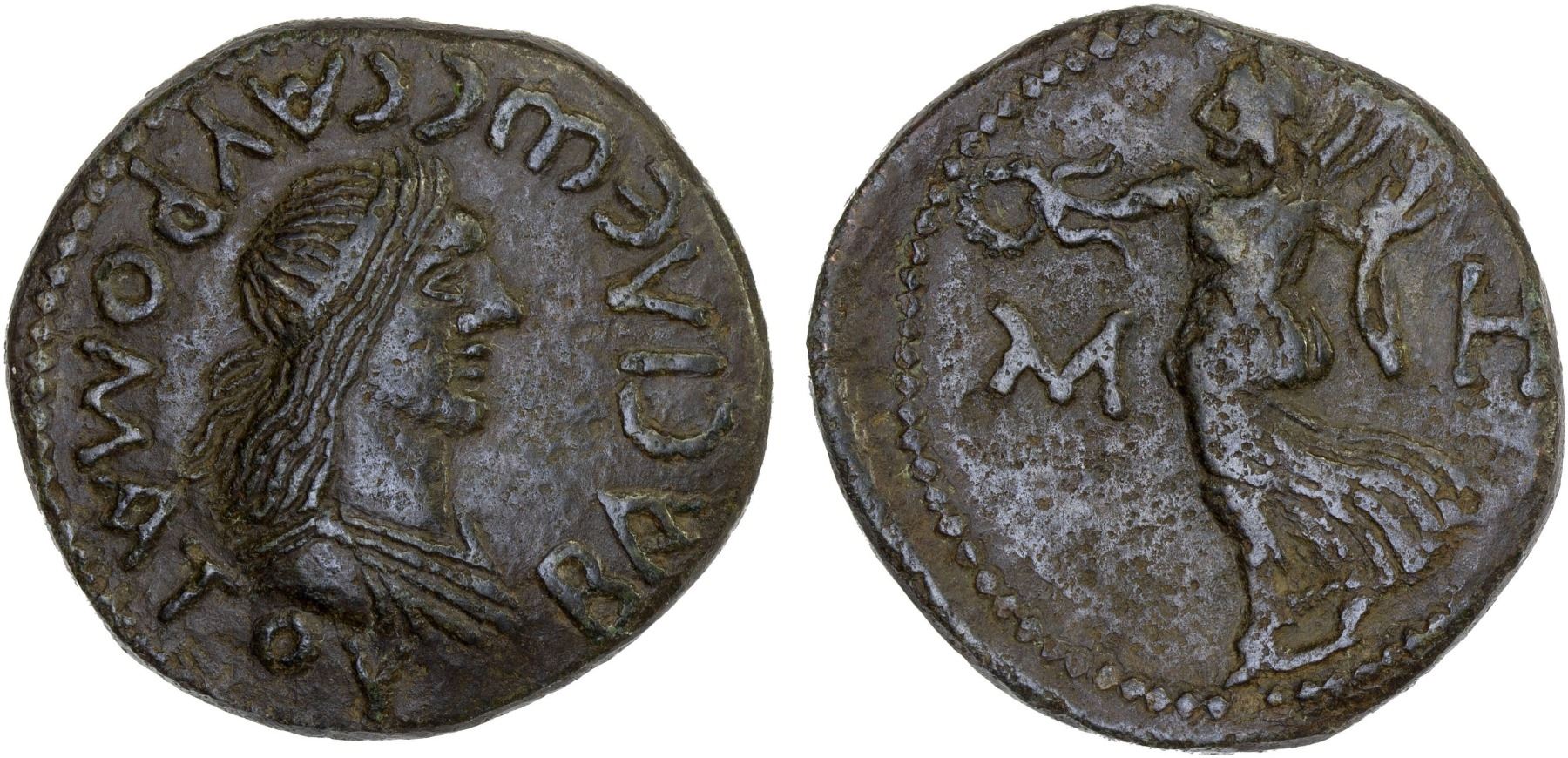 BOSPOROS: Sauromates I, ca. 93-123 AD, AE 48 units (9.49g), MacDonald-397, diademed and draped bust right // Nike advancing left, holding out wreath, MH (mark of value) across field, light porosity, VF.