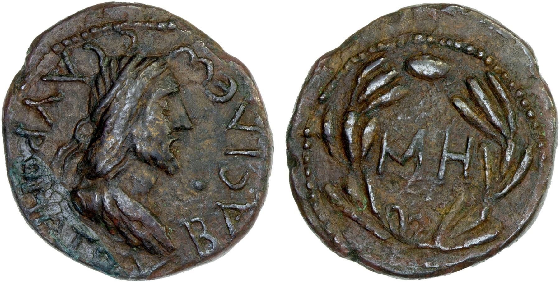 BOSPOROS: Sauromates II, ca. 174-210 AD, AE 48 units (6.23g), Frolova, pp. 193-4, pl. XLII.6-12, RPC-3882, diademed and draped bust right // MH within wreath, light adhesion, faint traces of smoothing, VF-XF.