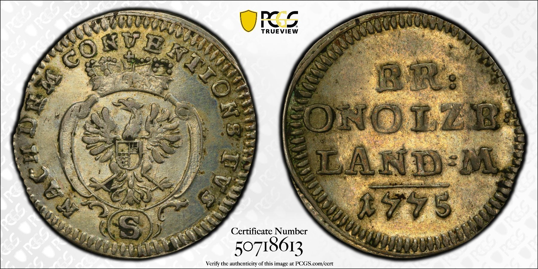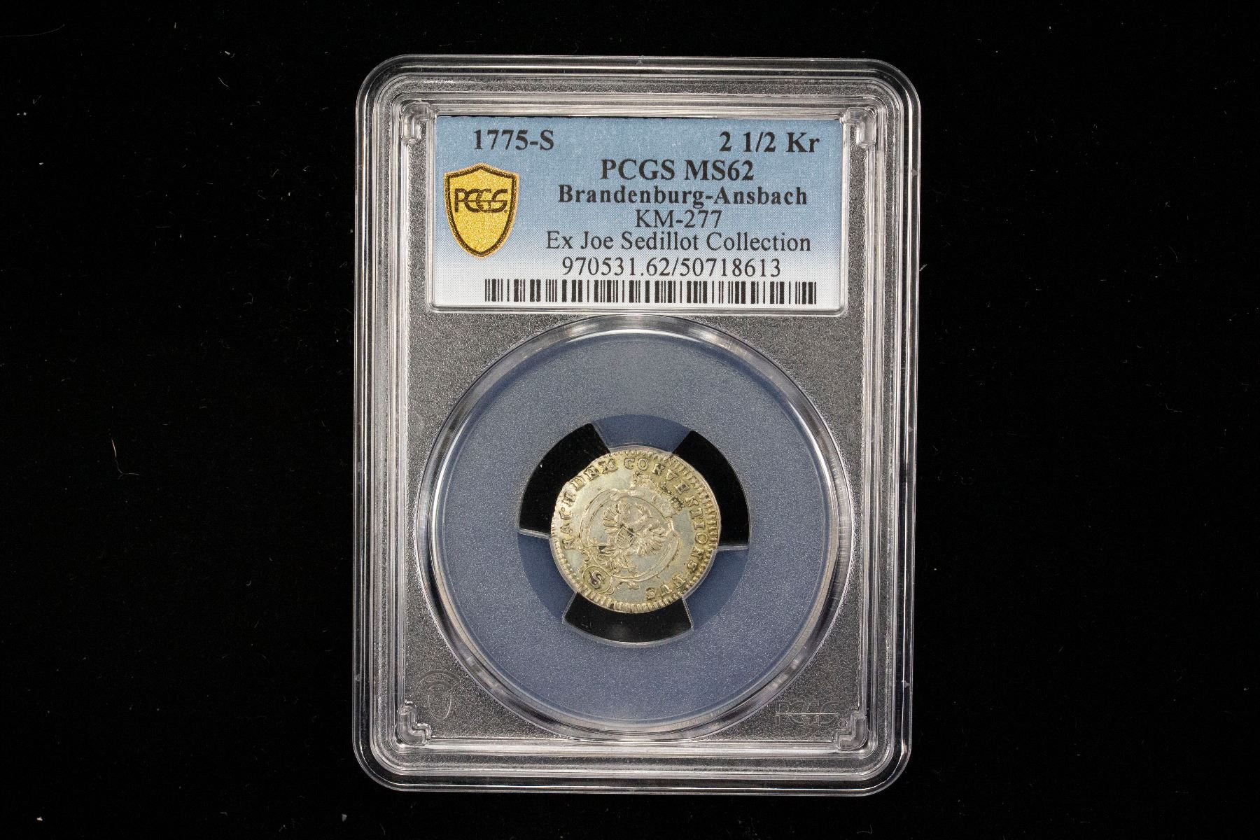 BRANDENBURG-ANSBACH: Karl Alexander, 1757-1791, AR 2 1/2 kreuzer, 1775, KM-277, C-76, minted in Schwabach, a pleasing lustrous mint state example, PCGS graded MS62, ex Joe Sedillot Collection. Finest graded 'top pop' by PCGS!In 1780, Karl Alexander founded his own bank, the Hochfürstlich-Brandenburg-Anspach-Bayreuthische Hofbanco, out of which later came the Bayerische Hypotheken- und Wechselbank "Bavarian Mortgage and Change Bank", which was absorbed into the present day HypoVereinsbank. One of Karl Alexander's enterprises earned income from hiring auxiliary troops to King George III of Great Britain for the American Revolutionary War. He had nominal command over the "Frankish Army" of 1,644 mercenaries, of whom only some 1,183 returned to their homeland in 1783. Karl Alexander leased further troops to Holland. With these incomes, he paid down the principality's debts, which amounted to 5,000,000 guilders at the time he inherited the throne in 1757. By the time of his abdication 34 years later, the principality's debt stood at only 1,500,000 guilders.