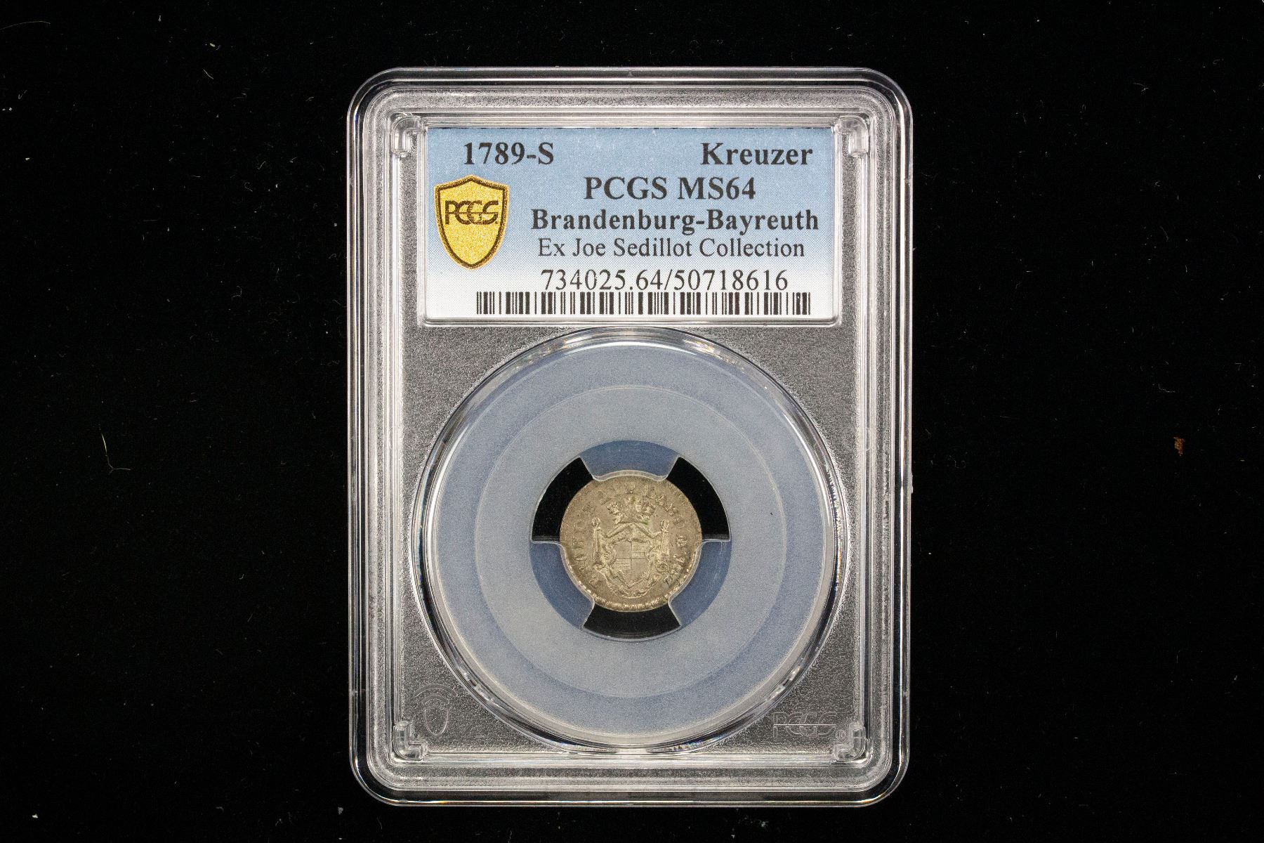 BRANDENBURG-BAYREUTH: Friedrich III, 1735-1763, BI kreuzer, 1789, KM-275, C-83, minted in Schwabach, a wonderful lustrous mint state example, PCGS graded MS64 (top pop), ex Joe Sedillot Collection. Frederick has the reputation of being an enlightened monarch. In Bayreuth, Frederick is referred to as "the Beloved." In his residence of Bayreuth, he promoted the sciences and arts and owned numerous buildings. The cultured margrave showed his appreciation of art and science by establishing the margraviate's Regional University in Bayreuth in 1742, which was moved one year later, in 1743, to Erlangen. Therefore, the University of Erlangen bears his name until today.