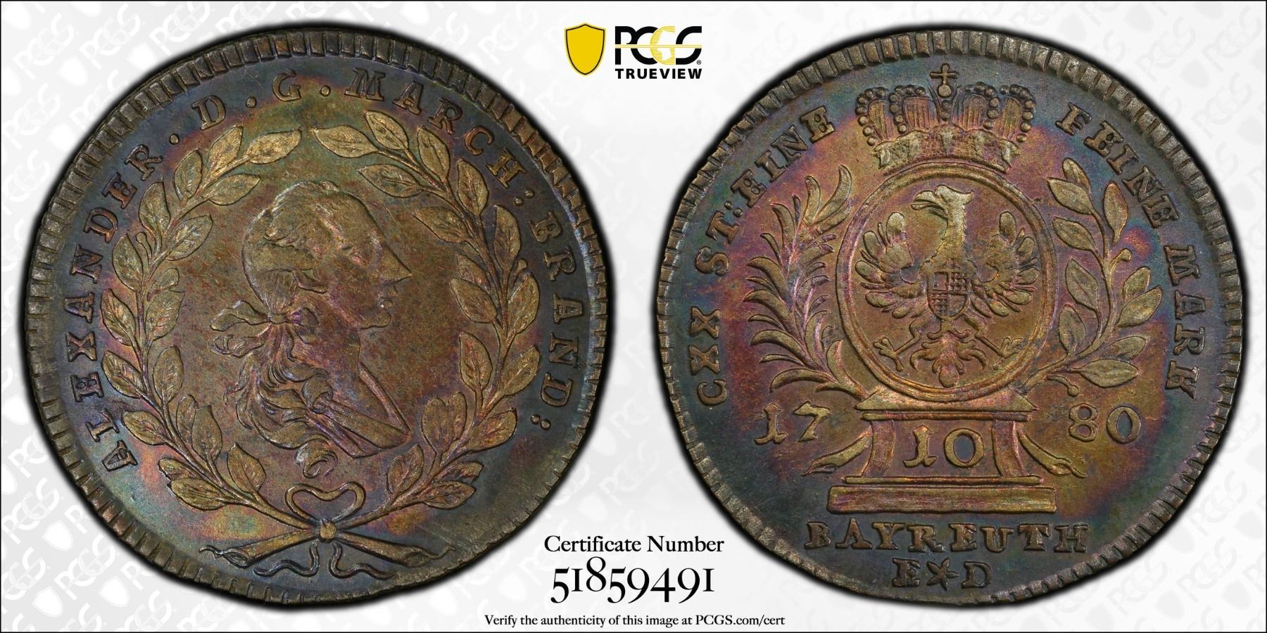 BRANDENBURG-BAYREUTH: Karl Alexander, 1769-1791, AR 10 kreuzer, 1780, PCGS MS62