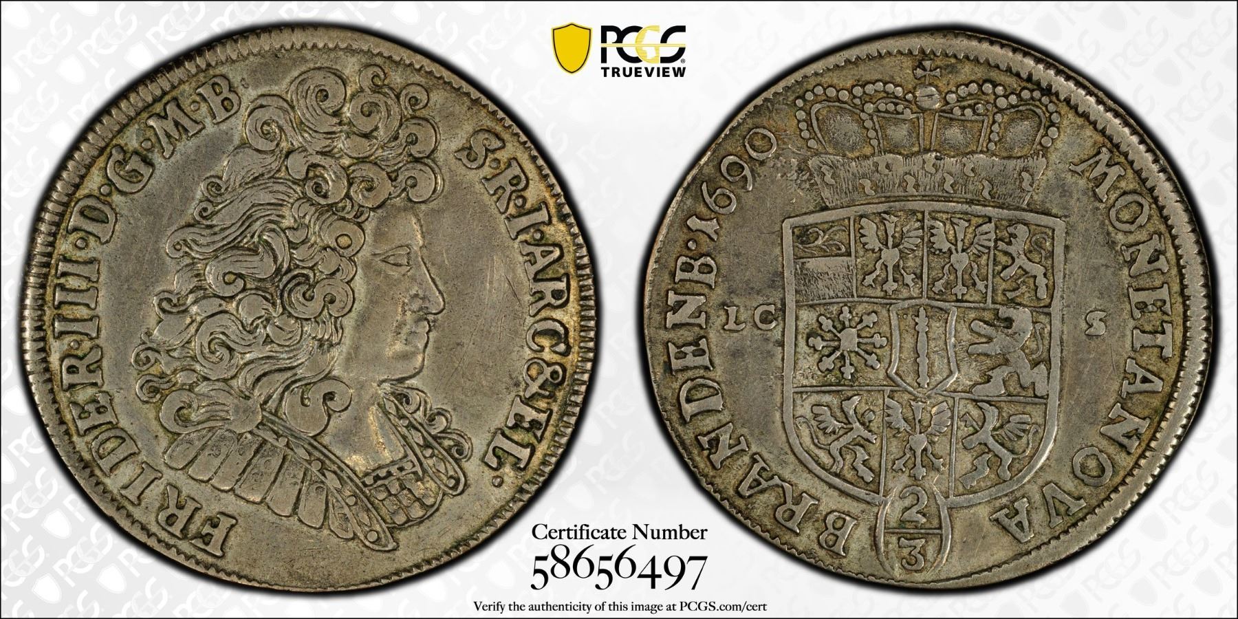 BRANDENBURG-PRUSSIA: Friedrich III, 1688-1701, AR 2/3 thaler, Berlin, 1690, PCGS XF details